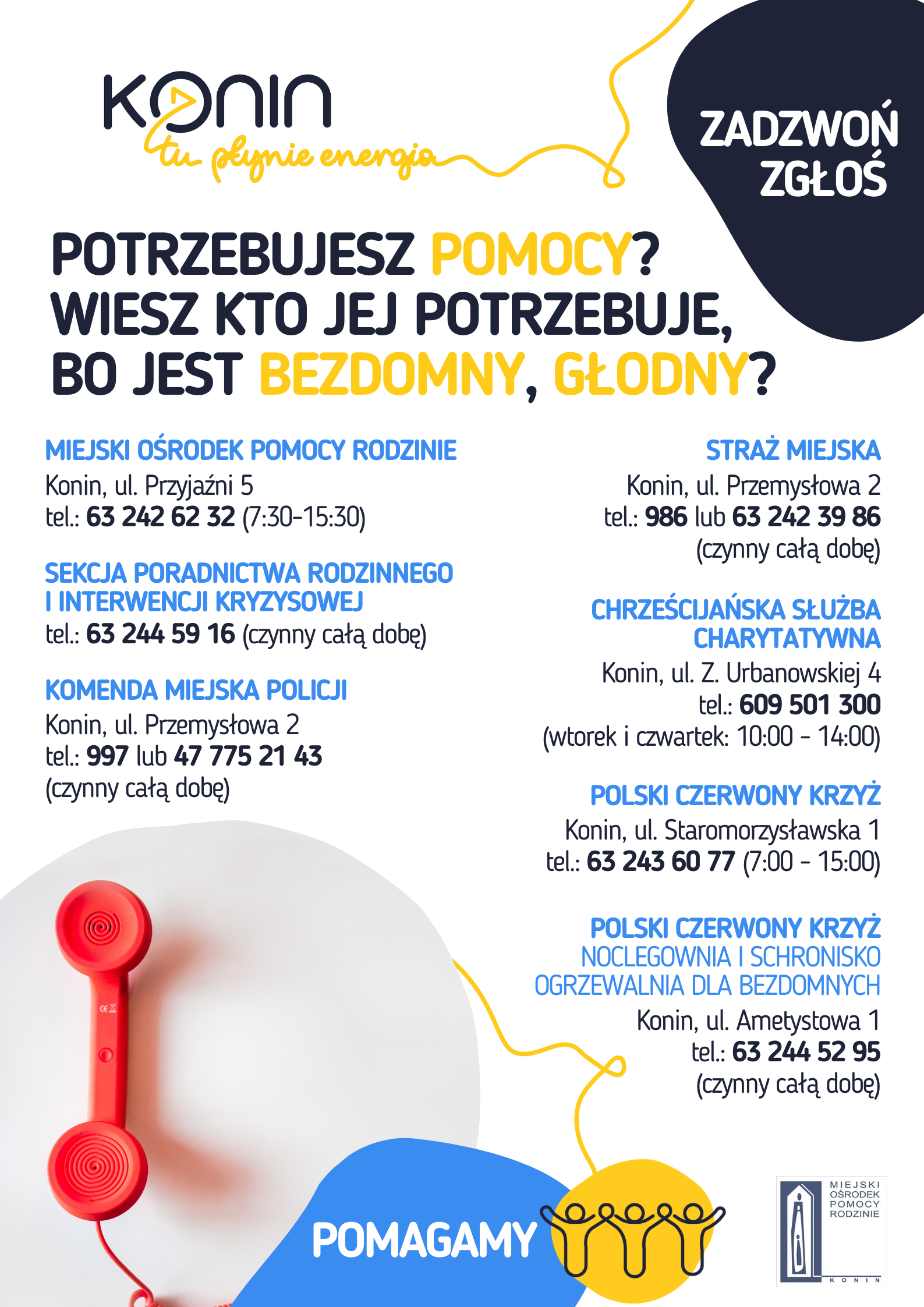Miejskie Centrum Zarządzania Kryzysowego w Koninie apeluje o ostrożność – zarówno do kierowców, jak i pieszych. W powiecie konińskim doszło już w tym sezonie jesienno-zimowym do śmierci z wychłodzenia. Warto więc zwrócić uwagę na osoby, które potrzebują pomocy, i zgłosić to w aplikacji Krajowa Mapa Zagrożeń lub telefonicznie – pod numerem alarmowym 112, kontaktując się ze strażą miejską czy MOPR. Całodobowo można się kontaktować z MCZK poprzez adres e-mail: wzk@konin.um.gov.pl.