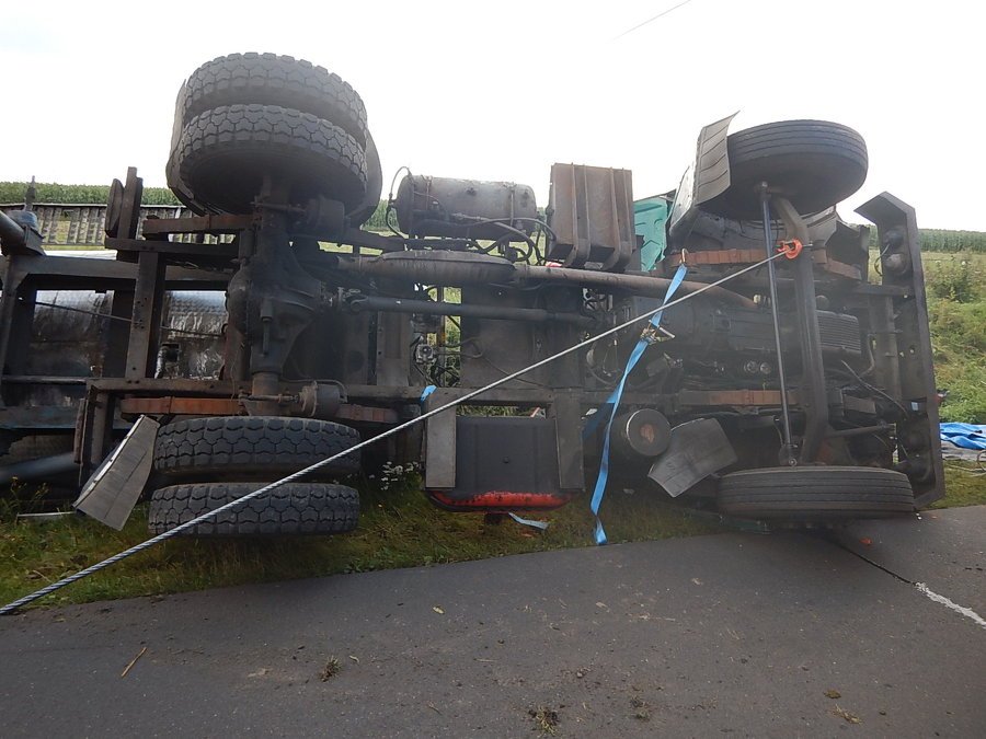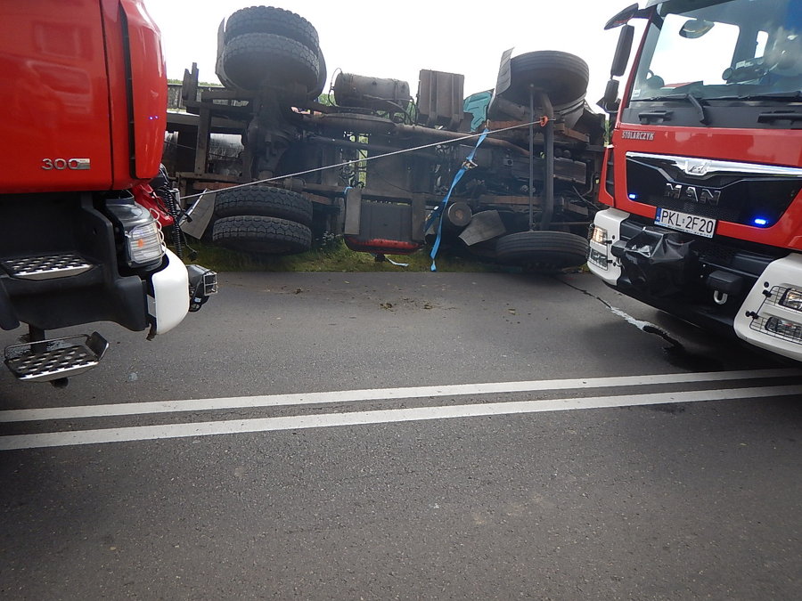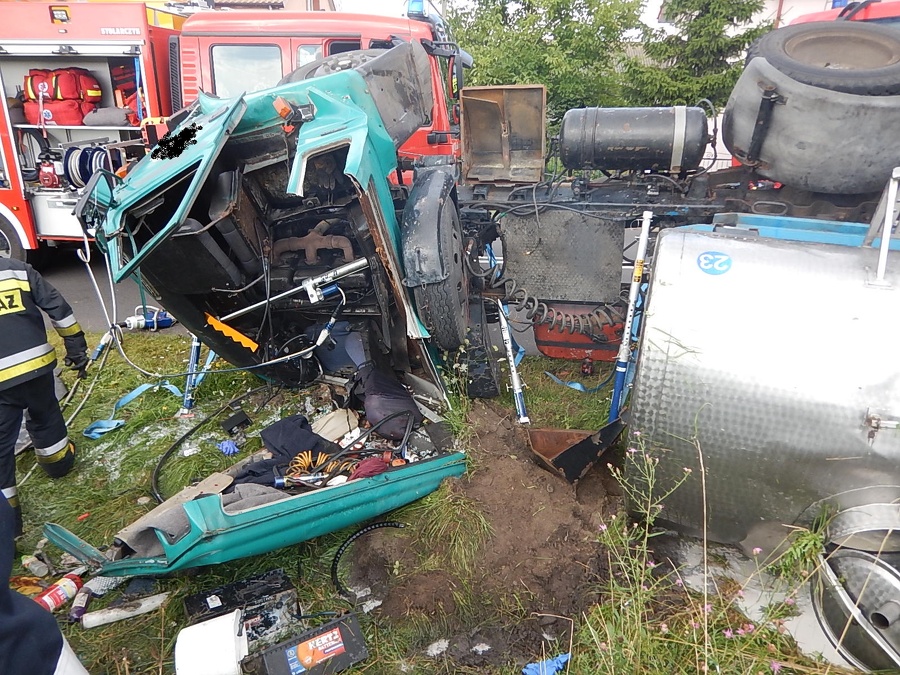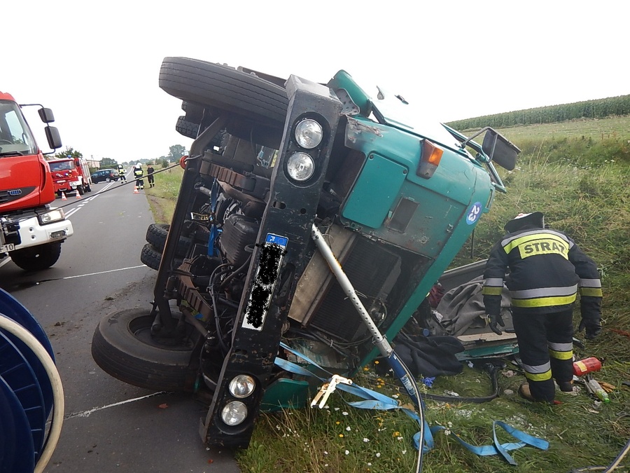 Wczoraj na prostym odcinku drogi samochód ciężarowy przewożący mleko zjechał do przydrożnego rowu i przewrócił się na bok. Na miejscu pojawiły się dwie jednostki straży pożarnej.