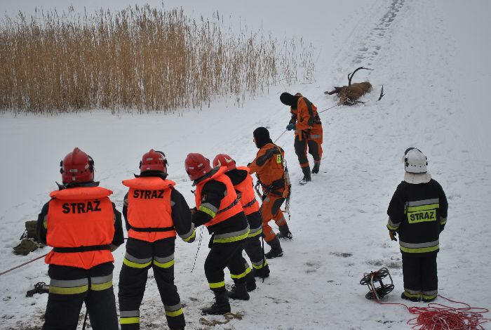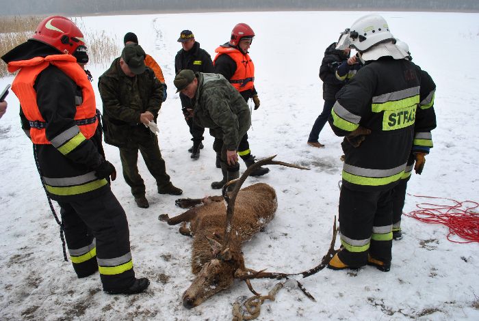 Sygnał o jeleniu leżącym na lodzie wpłynął do dyżurnych konińskiej straży pożarnej ok. godz. 9.35. Na miejsce skierowane zostały trzy jednostki z Konina, Goliny i Kazimierza Biskupiego. - Kiedy przyjechaliśmy jeleń jeszcze żył. Nie wiedzieliśmy czy został postrzelony, czy też ma złamaną nogę – mówi Sylwester Grabiński z konińskiej straży pożarnej.