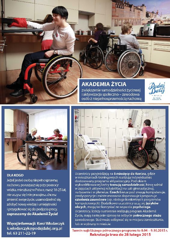 Akademia Życia przyjęła pierwszych uczestników w marcu 2014r. Do tej pory skorzystało z niej 7 osób z całej Polski, 5 z nich już odbywa lub odbyło staże zawodowe, a jedna podjęła pracę. Od połowy września 2014r. w Koninie samodzielność zdobywa kolejnych 8 osób, a w całym projekcie, do końca czerwca 2018r. weźmie udział 50 młodych osób z niepełnosprawnością ruchową, które zechcą zmierzyć się z samodzielnym życiem. Zainteresowani proszeni są o kontakt z Karolem Włodarczykiem z Fundacji im. Doktora Piotra Janaszka Podaj Dalej - tel. 63 211 22 19,