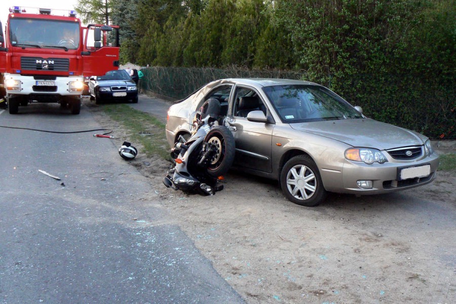 – Jadąca samochodem osobowym od Lichenia kobieta skręciła w lewo do posesji – poinformował nas st. asp. Marcin Jankowski z Komendy Miejskiej Policji w Koninie. - Jadący z przeciwka motocyklista nie zdołał wyhamować i uderzył w tylne prawe drzwi samochodu.