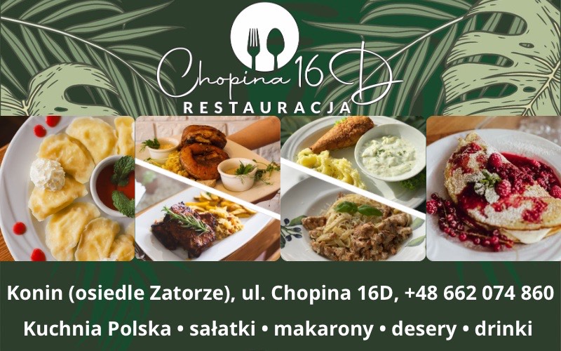 Jedną z miejscówek, która zapewnia jakość romantycznych, kulinarnych uniesień jest Restauracja Chopina 16D w Koninie to idealne miejsce na co dzień i od święta. Serwuje tradycyjne dania kuchni polskiej oraz pierogi, sałatki, makarony, desery i napoje.