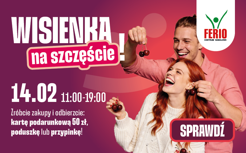 Coraz więcej par traktuje wspólne zakupy jako okazję do spędzenia czasu razem. W lutym Walentynki stają się dobrą okazją, by na chwilę zwolnić tempo, wybrać się na zakupy i sprawić sobie lub komuś bliskiemu drobną przyjemność. Właśnie z taką myślą Centrum Handlowe FERIO zaprasza 14 lutego w godz. 11:00–19:00 na walentynkową akcję „Wisienka na szczęście” – zrób zakupy i odbierz miły prezent: kartę podarunkową 50 zł, poduszkę lub przypinkę.