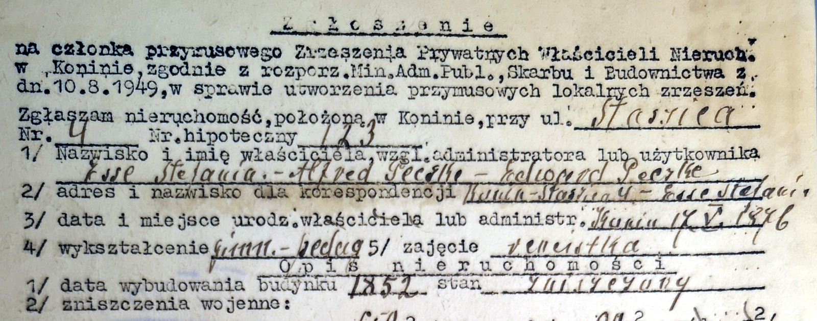 Zacznijmy od nazwy. Stefania Esse nie mogła wybudować kamienicy swojego imienia, bo urodziła się dopiero w 1876 roku, a więc mniej więcej ćwierć wieku po jej postawieniu. Ta data też zresztą nie jest tak całkiem pewna. Na żelaznej balustradzie narożnego balkonu widnieje wprawdzie rok 1859 (fot. 1), ale w dokumencie prawie o sto lat późniejszym sama pani Stefania w rubryce „data wybudowania budynku” zapisała „1852” (il. 2). Obok księgi meldunkowej, której zapisy miałem okazję kiedyś widzieć, „Zgłoszenie na członka przymusowego Zrzeszenia Prywatnych Właścicieli Nieruchomości w Koninie”, złożone przez Stefanię Esse w konińskim starostwie 26 maja 1950 roku, jest jedynym pisanym źródłem wiedzy o tej kamienicy.