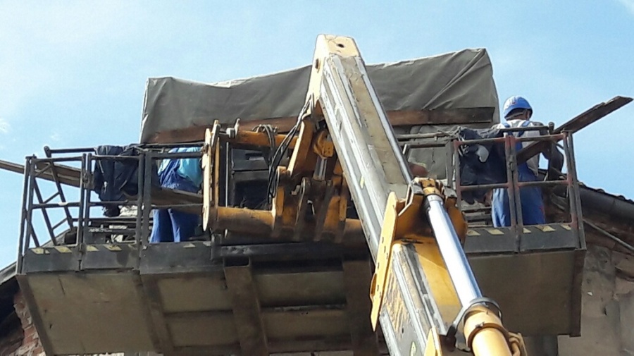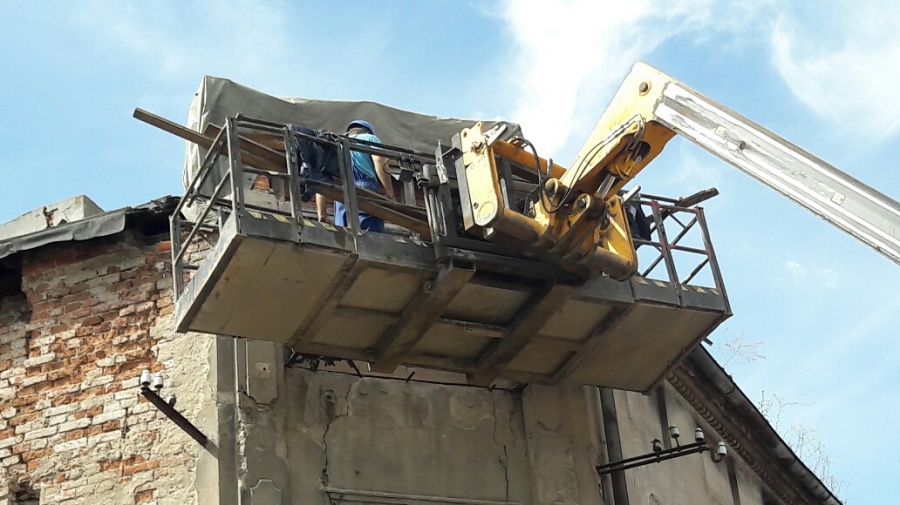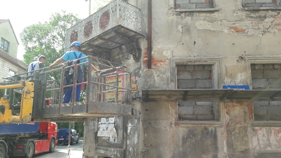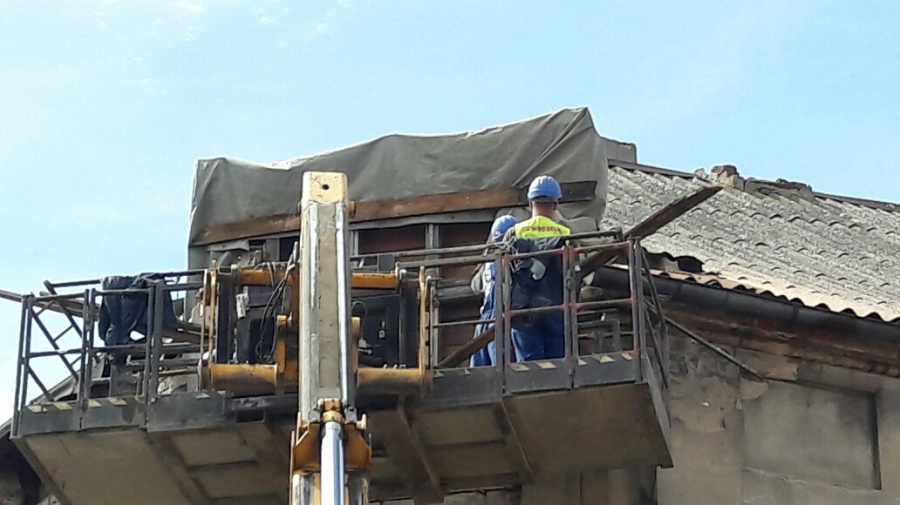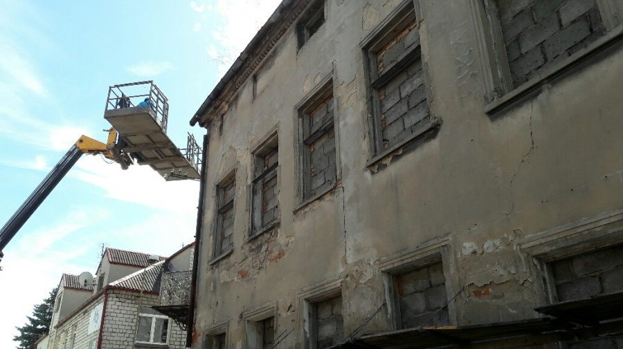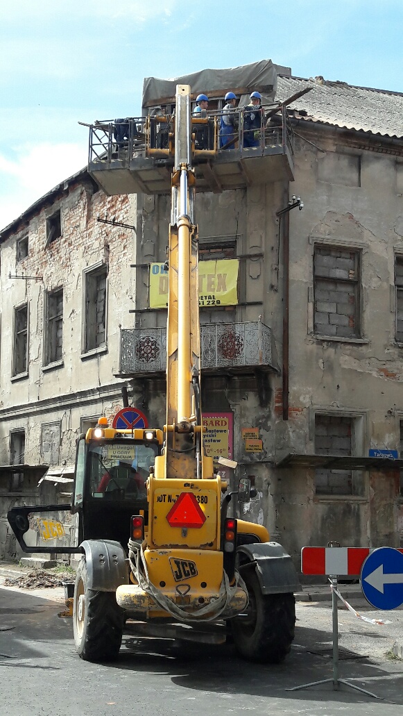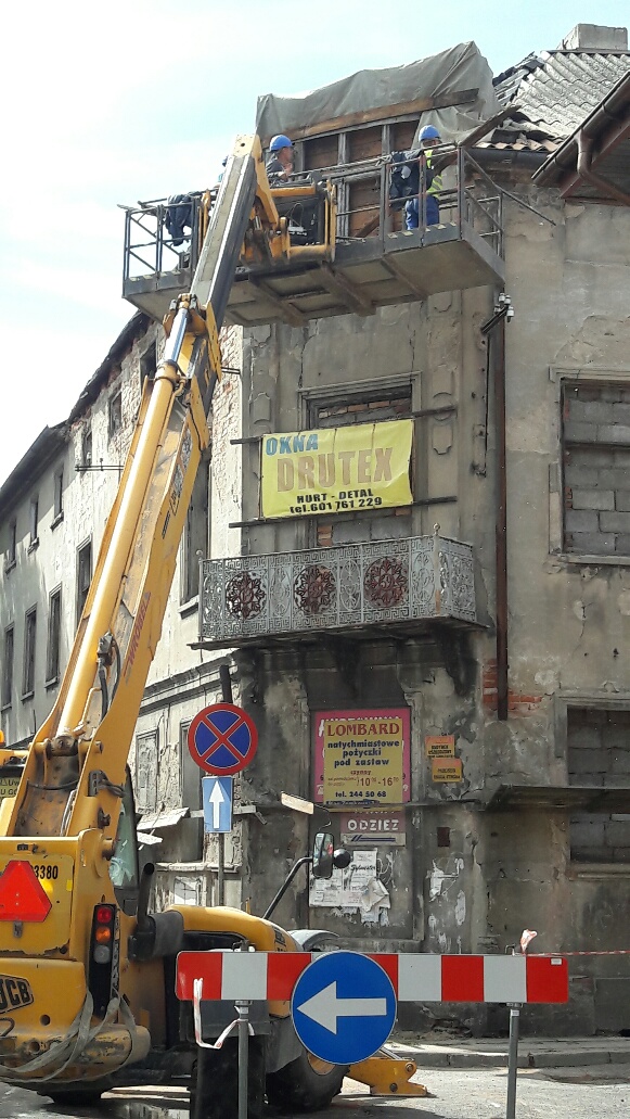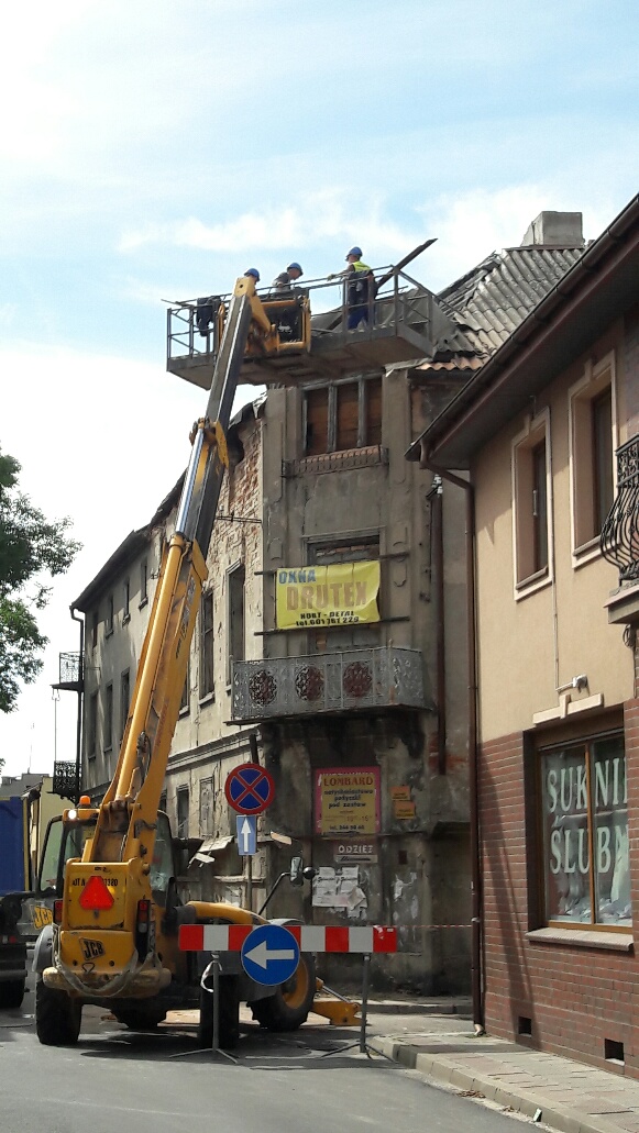 Zgodnie z zaleceniami nadzoru budowlanego, przystąpiono do zabezpieczania odpadających fragmentów kamienicy przy ul S. Staszica w Koninie.