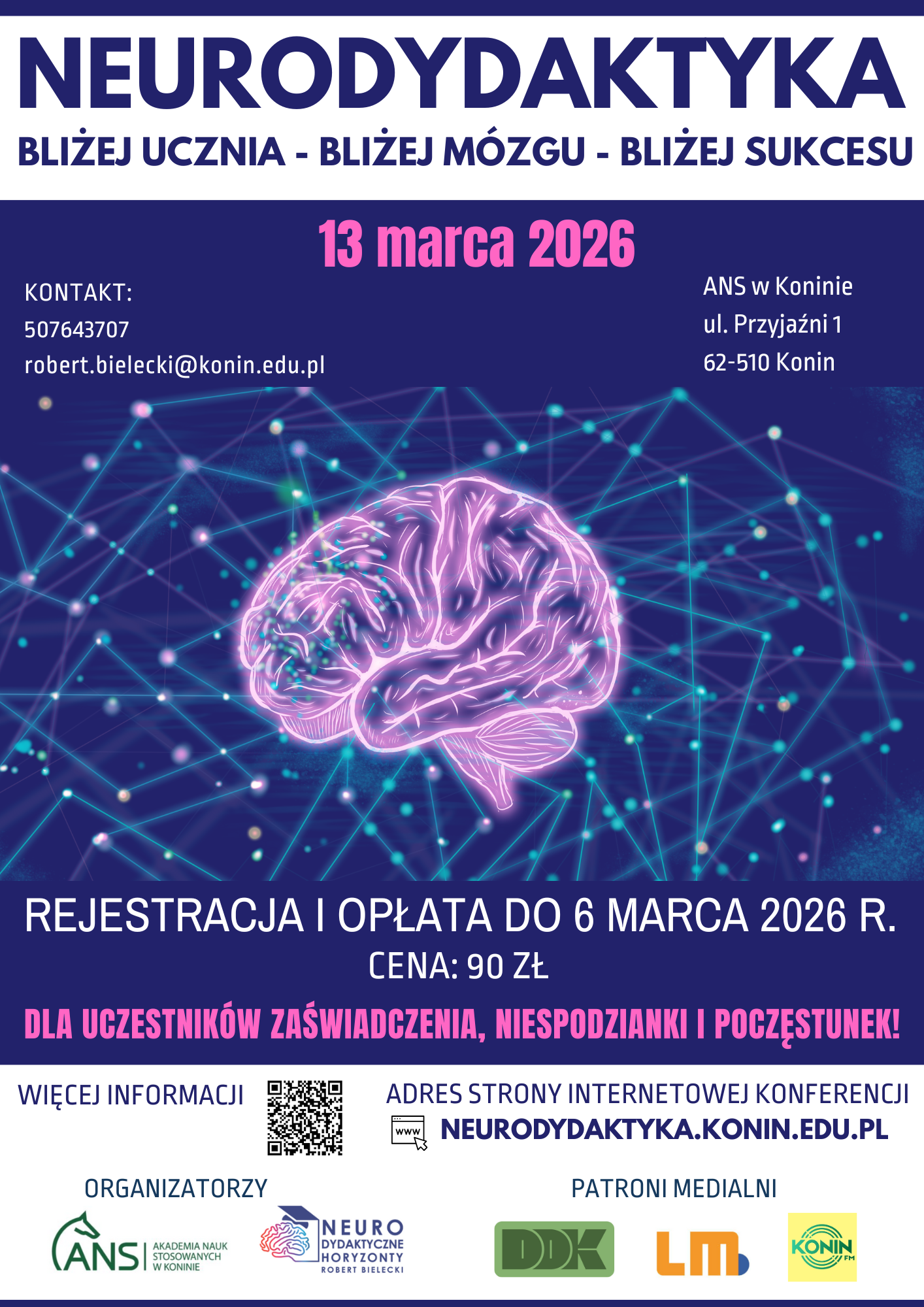Wydarzenie realizowane jest wspólnie przez Neurodydaktyczne Horyzonty Robert Bielecki oraz Wydział Nauk Humanistycznych i Społecznych ANS w Koninie. Konferencja od lat przyciąga nauczycieli, pedagogów, psychologów, dyrektorów szkół oraz wszystkich zainteresowanych nowoczesnym podejściem do edukacji, opartym na wiedzy o funkcjonowaniu mózgu.