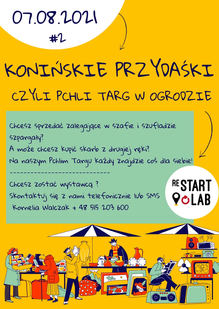 Restart Lab zaprasza do swojej siedziby, gdzie odbędą się “Konińskie Przydaśki - czyli pchli targ w ogrodzie”. Konińskie Przydaśki to przestrzeń do spotkania kolekcjonerów komiksów, monet, biżuterii, znaczków, płyt winylowych i innych rozmaitości, który nie znajdziemy w sklepach. To także stanowiska pasjonatów historii i sztuki, twórców handmade, sprzedawców, zabawek, odzieży i wielu innych! Każdy ma możliwość wystawienia swojego stoiska.