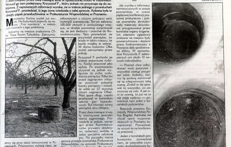 Natychmiast zorganizowano wyjazd z podejrzanym do Kiszew pod Tuliszkowem, mniej więcej trzynaście kilometrów od domu Olka. Ciało chłopca leżało w bardzo głębokiej nieużywanej studni, położonej w głębi sadu. Gdyby nie zeznania Krzysztofa F., byłoby bardzo trudno je znaleźć, bo dla zamaskowania mężczyzna przykrył je jeszcze gałęziami. Zwłoki dziecka wydobyto i przewieziono do zakładu medycyny sądowej w nocy z 27 na 28 marca.