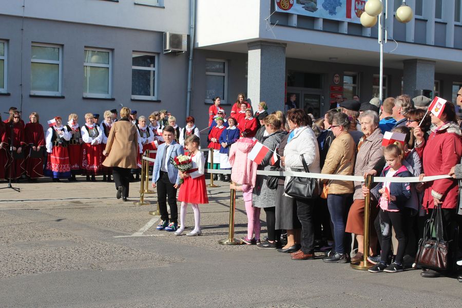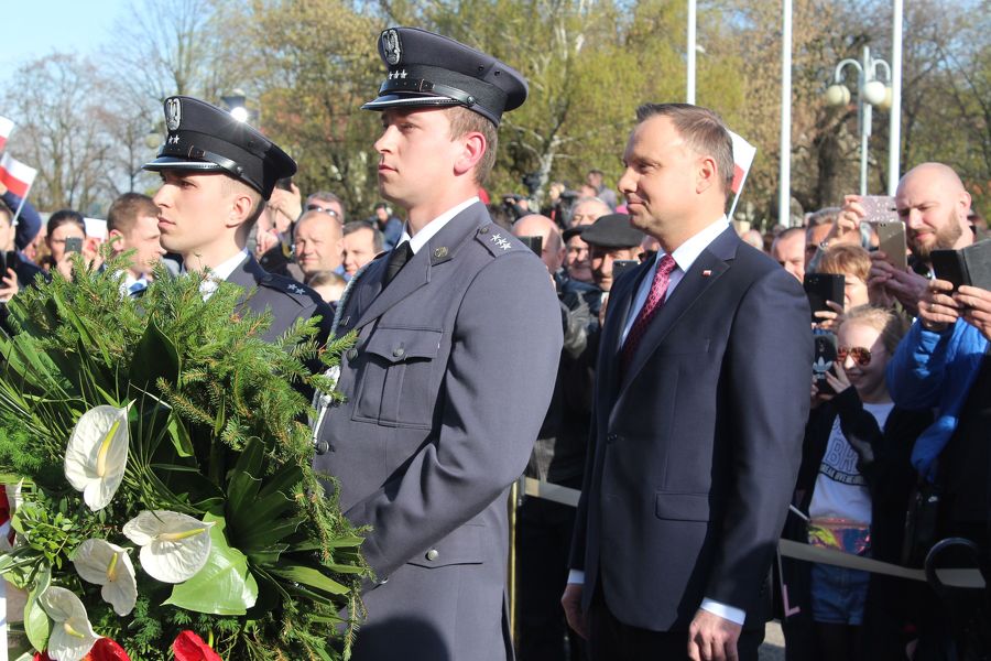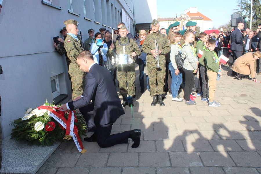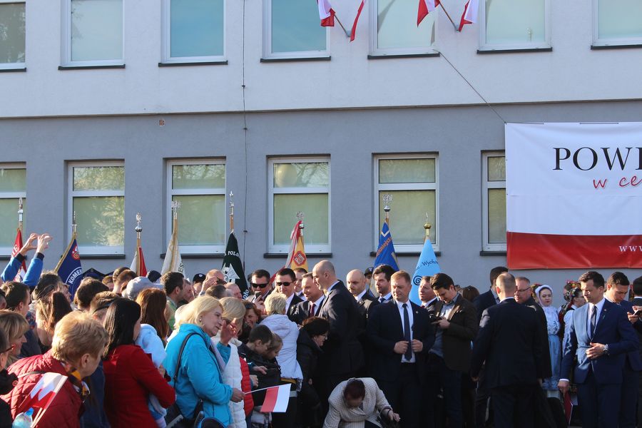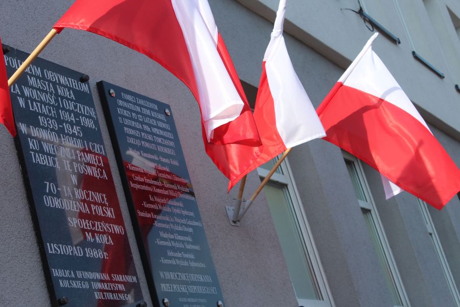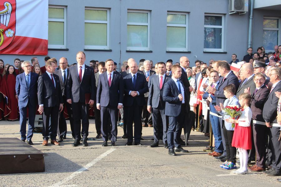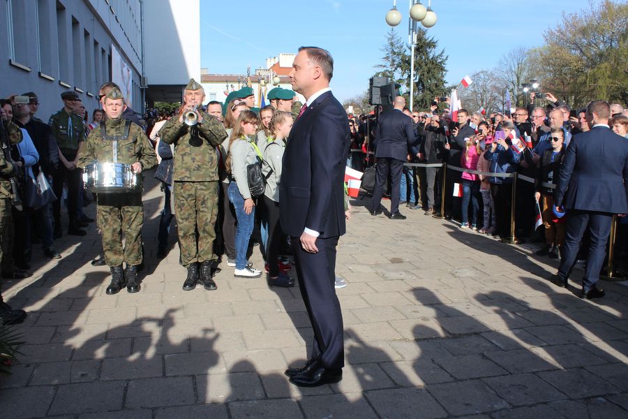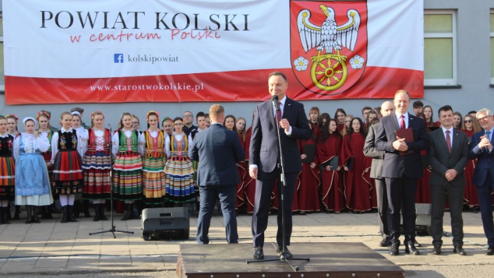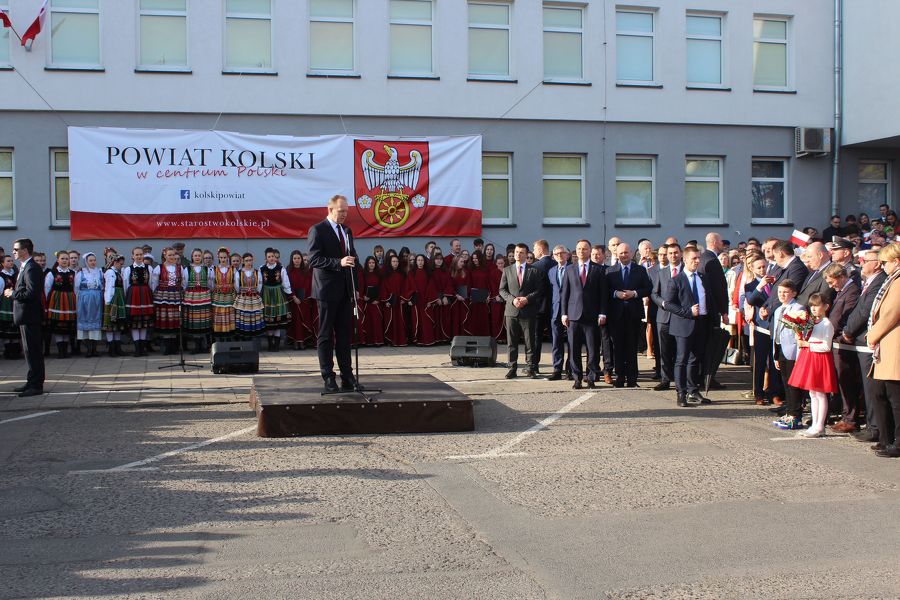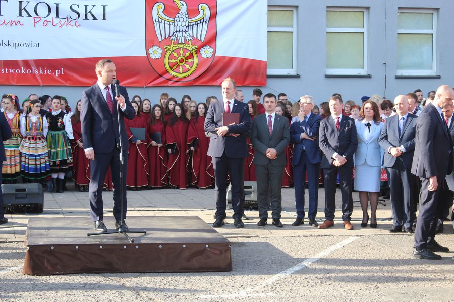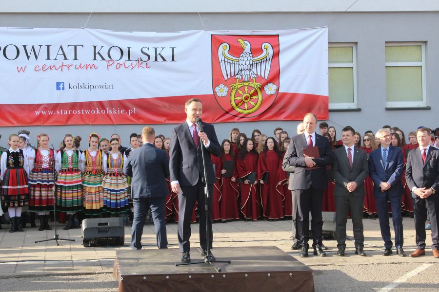 Prezydent Andrzej Duda złożył najpierw kwiaty pod tablicami poświęconymi zasłużonym obywatelom ziemi kolskiej, a umieszczonymi na murach starostwa, a następnie przemówił do zebranych. Nieco dalej, poza wyznaczonym terenem, na który można było wejść po przekroczeniu bramek, stanęli z wykrzyknikami strajkujący nauczyciele, którzy gorąco reagowali na słowa prezydenta, zwłaszcza te, które dotyczyły edukacji. A ten temat zajął znaczące miejsce w wystąpieniu prezydenta RP.