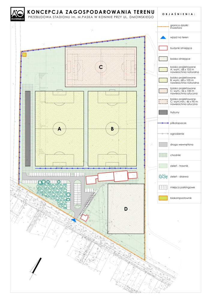 Zaznaczmy od razu - stadion przy ul. Dmowskiego ma być docelowo obiektem treningowym, a nie głównym miejskim stadionem. W ramach przebudowy ma stanąć nowa trybuna ażurowa na 800 miejsc oraz wybudowane trzy płyty - jedna pełnowymiarowa z naturalną nawierzchnią (tam, gdzie istnieje teraz; wymiary: 68 na 105 m), jedna pełnowymiarowa ze sztuczną nawierzchnia (położone po wschodniej stronie; wymiary: 68 na 105 m) oraz jedna, mniejsza płyta (wymiary: 56 na 100 m) z naturalną nawierzchnią położona na północ od dwóch pierwszych płyt, w miejscu, gdzie obecnie jest niepełnowymiarowe boisko. Ponadto na stadionie zachowana byłaby czwarta niewymiarowa płyta ze sztuczną nawierzchnią, która istnieje już teraz po prawej stronie od wjazdu na obiekt (cały wstępny projekt dostępny jest w galerii zdjęć). Boiska mają być oświetlone.