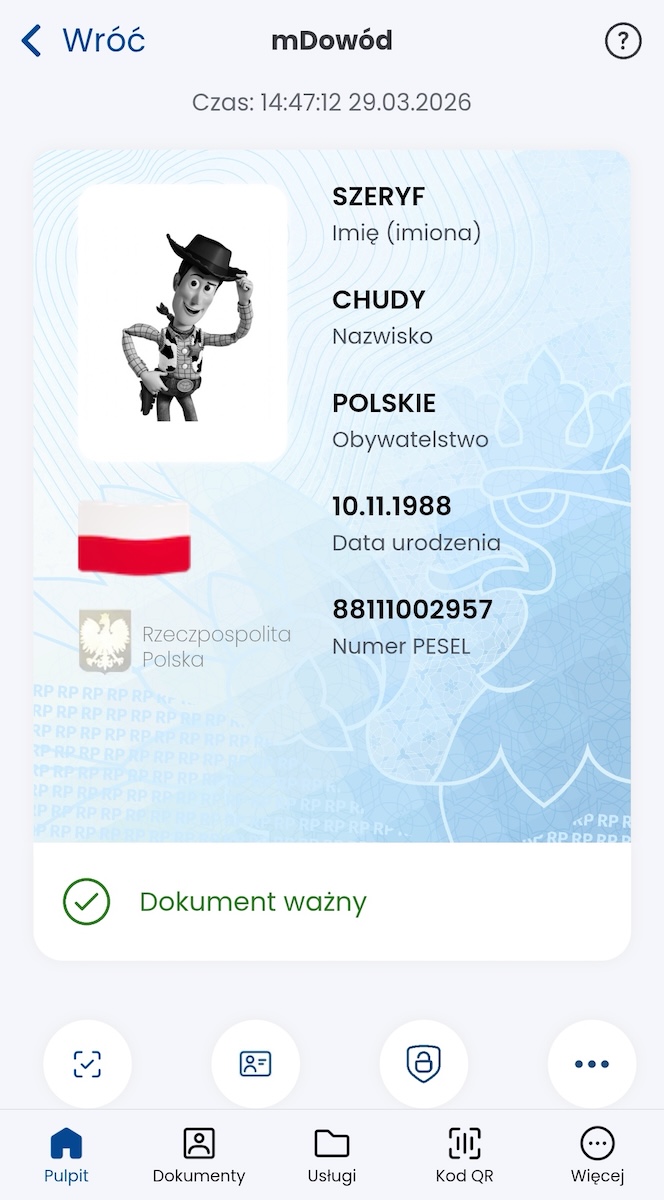 Screen z fałszywego e-Dowodu, który udało nam się stworzyć przy pomocy jednej z aplikacji. Zamiast swoich danych posłużyliśmy się postacią z popularnej animacji.