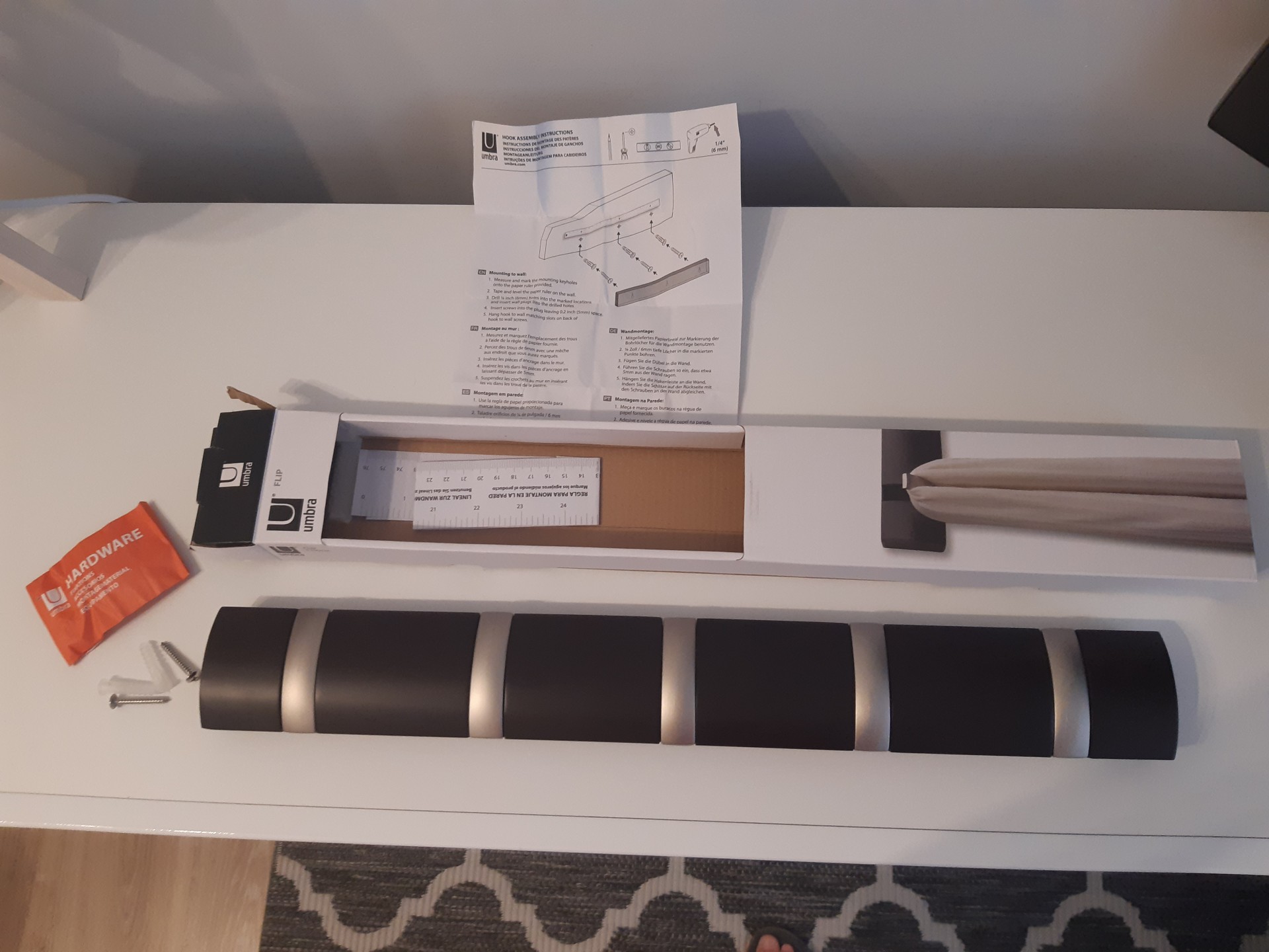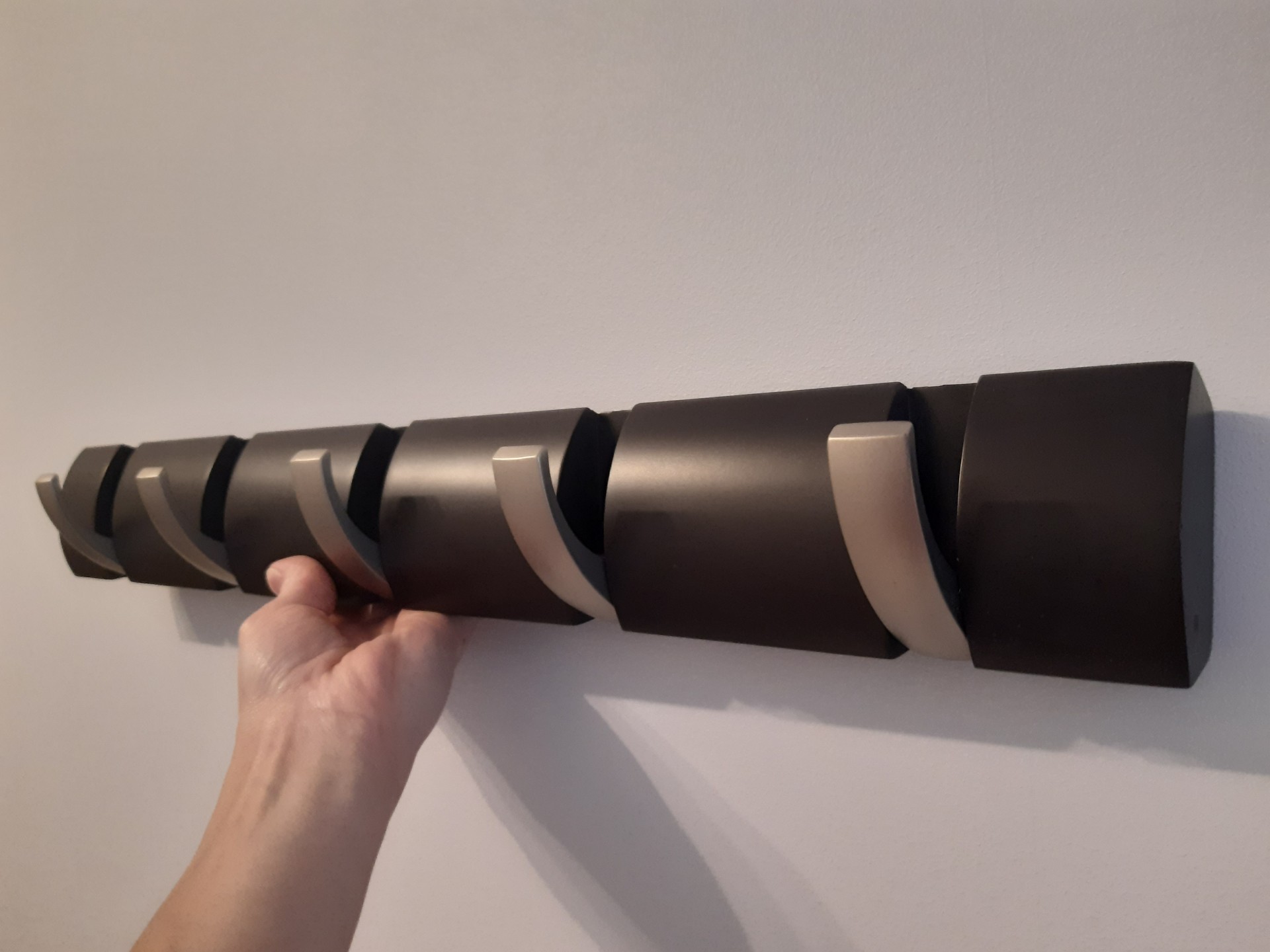 Sprzedam nowoczesny, nieużywany (w oryginalnym opakowaniu i z dołączonym zestawem montażowym) wieszak ścienny w kształcie listwy z 5 haczykami (listwa w kolorze palonej kawy, haczyki srebrne). Wymiary (cm): 50,8 x 6,5 x 3,1. Odbiór osobisty w centrum Konina lub w okolicach V osiedla. Preferuję kontakt SMS, odpiszę albo oddzwonię.