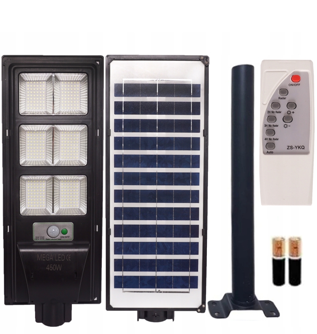 ZEROWY KOSZT UTRZYMANIACałoroczna lampa solarna, doskonale nadaje się do oświetlenia ulic, posesji, ogrodów, bram wjazdowych, parkingów i placów. Sprawdzi się doskonale jako oświetlenie podnoszące bezpieczeństwo, bez konieczności stosowania dodatkowego źródła energii elektrycznej i jest całkowicie darmowa w eksploatacji.CZUJNIK RUCHU I ZMIERZCHUDzięki wbudowanemu czujnikowi ruchu i zmierzchu będzie zapalać się np. w nocy gdy lampa wykryje zmierzch i ruch wokół siebie. Dzięki temu, nie musisz już pamiętać o włączaniu i wyłączaniu światła na zewnątrz. Lampa posiada specjalny uchwyt, który można regulować i dostosować do miejsca, gdzie ma padać światło.Dane Techniczne:Moc: 450WCzujnik zmierzchu: TAKCzujnik ruchu: TAKKlasa: IP68Żywotność: 50000h (LED)Kąt świecenia: 120°Kolor światła: 6000k (biały zimny)Temperatura pracy: -30 DO 60°C,Kolor: czarnyWysokość montażu: 3 ~ 6 MNie pobiera dodatkowej energii przy starcie: TAKCzas działania:ok. 12 godzin (Normalne użytkowanie)ok. 6 godzin (Ciągłe świecenie 100% jasności)ok. 20 godzin(świecenie w trybie gotowości [20% jasności])Czas ładowania:6-8 godzin na jasnym słońcu