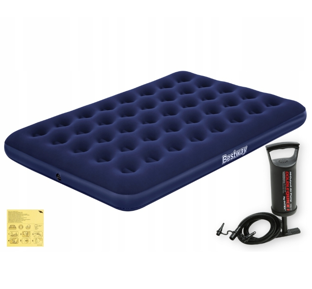 CHARAKTERYSTYKA MATERACAflokowane pokrycie górneklasyczny materac welurowyidealny pod namiot i do domudmuchany stelaż coil-beamzawór szybkiego pompowaniałatka naprawcza w komplecieSPECYFIKACJA MATERACAwymiary: 203 x 152 x 22 cmwaga 4,70 kgmateriał PVC, welurprzeznaczenie dwuosobowydo użytku wewnętrznego i zewnętrznegoCHARAKTERYSTYKA POMPKIpompa 30 cmpompowanie w obie strony3 wymienne końcówkidługi elastyczny ważwytrzymała konstrukcjado wszystkich dmuchanych produktówSPECYFIKACJA POMPKIwymiary 30 cmwaga 0,4 kgpojemność 700 cm 3przeznaczenie produkty dmuchanedo użytku wewnętrznego i zewnętrznegopodłączenie: elastyczny wążMaterac turystyczny Bestway Queen do użytku dwusobowego. Materac został wykonany z wytrzymałego materiału PVC pokryty na górnej części miękkim welurem w kolorze granatowym. Nadaje się zarówno do użytku wewnętrznego jak i zewnętrznego, idealnie sprawdzi się pod namiotem lub w domu jako zapasowe łóżko dla gości.Produkt wykonany z solidnego tworzywa PVC z flokowanym pokryciem górnym. W dotyku przypomina miękki, puszysty welur. Dzięki niemu pościel nie zsuwa się z gładkiego PVC oraz sam materac jest przyjemniejszy w dotyku. Dmuchany stelaż coil-beam, czyli łączenie górnej i dolnej warstwy za pomocą rur odpowiada za wytrzymałość całości oraz charakterystyczny wygląd. Materac jednoosobowy można szybko przygotować do użytku dzięki zaworowi szybkiego pompowania. Produkt przeznaczony zarówno do użytku wewnętrznego, jak i zewnętrznego.
