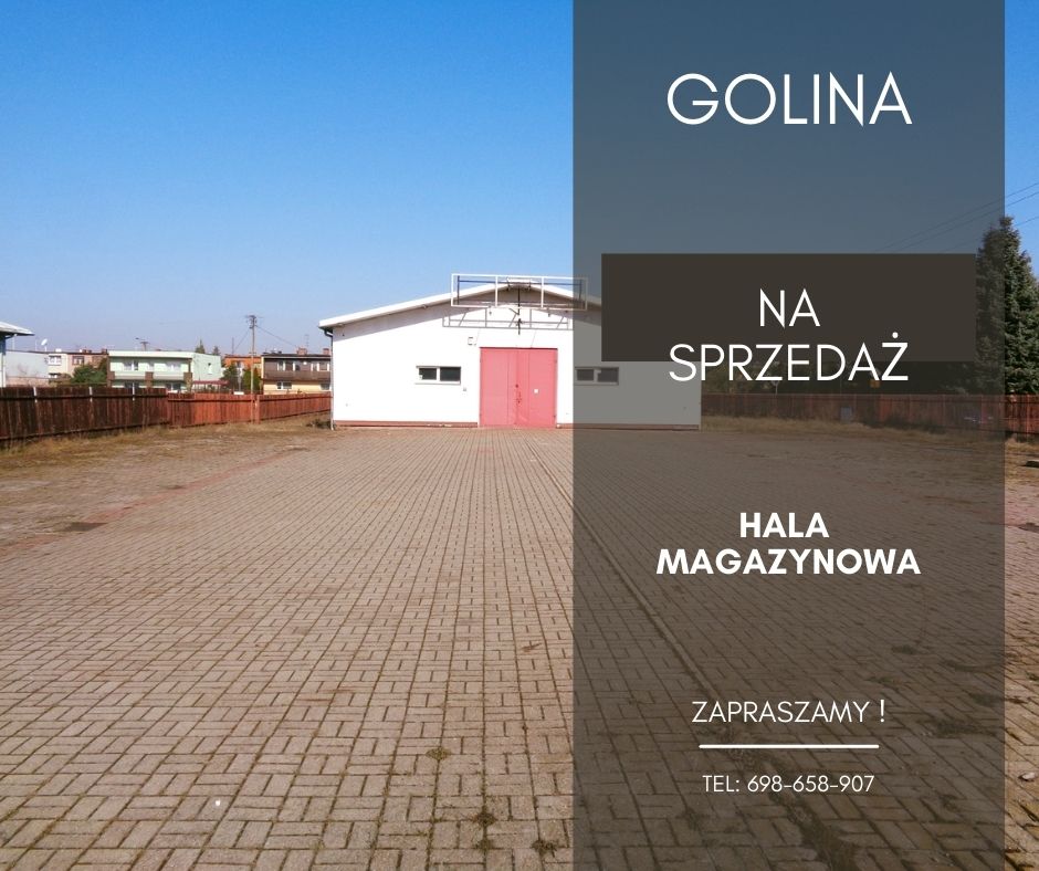 Sprzedam halę produkcyjno/magazynową zlokalizowaną w miejscowości Golina. Idealne miejsce na prowadzenie działalności gospodarczej, cicha i spokojna okolica. Atrakcyjna lokalizacja z dogodną komunikacją (droga krajowa 92 – 200 metrów, A2 – 7 km, Konin – 10 km, Słupca – 17 km, Września – 40 km, Kalisz – 70 km, Poznań – 90 km) to bez wątpienia główne zalety nieruchomości. Nieruchomość o powierzchni 2332 m2 zabudowana halą produkcyjno/magazynową wysokiego składowania o powierzchni 564 m2. Działka płaska o regularnym kształcie prostokąta. Nieruchomość zagospodarowana z własnym i utwardzonym parkingiem (plac manewrowy o powierzchni około 1050 m2), całkowicie ogrodzona (ogrodzenie metalowe), możliwość wjazdu z trzech stron (trzy bramy wjazdowe). Hala murowana z lat 70-tych z gazobetonu i ocieplona styropianem na dachu płyta obornicka, ocieplona pianką, okna PCV. Budynek w pełni przystosowany do prowadzenia działalności produkcyjno/magazynowej. Dwie bramy wjazdowe (wysokość - 3,30 m, szerokość – 3,15 m), wewnątrz hali wysokość do belki – 4,80 cm, na podłodze wylewka. Wewnątrz hali wyodrębniono: pomieszczenie socjalne o pow. 15 m2 oraz pomieszczenie biurowe o pow. 17 m2. Media: prąd, woda, kanalizacja. Dodatkowo nieruchomość wyposażona w kanalizację deszczową, przyłącze gazowe na działce. Dojazd do posesji drogą asfaltową z trzech stron.