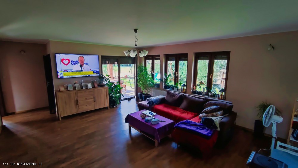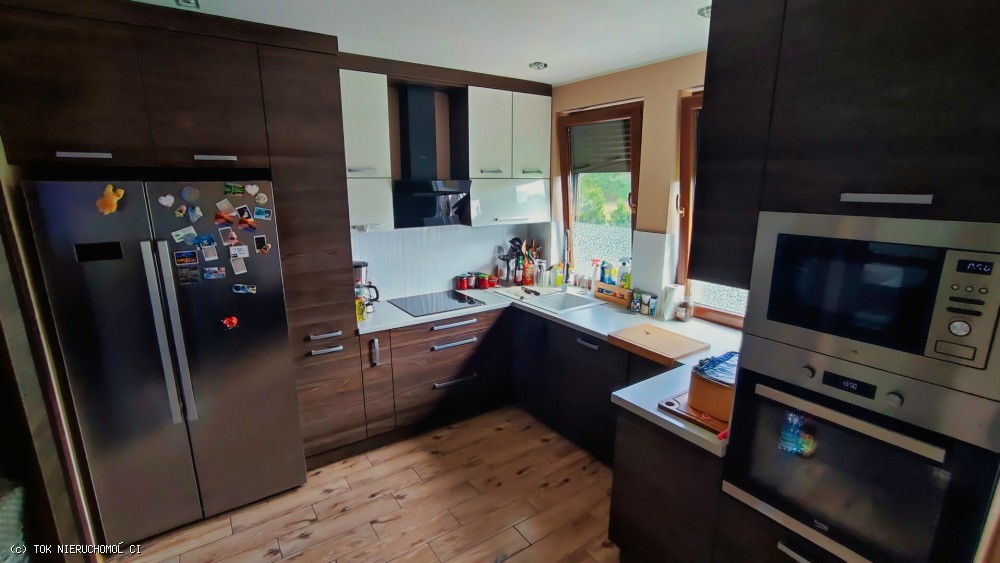 Budynek o podwyższonym standardzie, na parterze znajduje się pokój dzienny z wyjściem na zadaszony taras, kuchnia z jadalnią, cztery sypialnie, dwie łazienki oraz komunikacja. Na poddaszu zaaranżowano dużą sypialnię, pralnię oraz pomieszczenia pomocnicze. Podłogi na parterze kryte panelami winylowymi, kuchnia oraz łazienka w estetycznych płytkach. Stolarka okienna podwyższonej klasy.