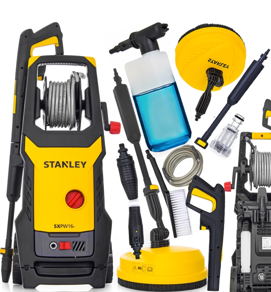 Markowa kombinacja od Stanley umożliwia efektywne mycie różnych powierzchni. Kompleksowy zakup gwarantuje dokładne mycie punktowe dyszami ale również bardziej specjalistyczne mycie kostki czy nawet felg samochodowych, a dołączone płyny pomogą w dokładnym myciu.Pistolet z szybkozłączem