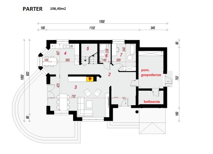 - parter: salon, kuchnia z jadalnią, pokój (biuro), łazienka z wc i prysznicem, przestronny holl wejściowy, pom. gospodarcze, kotłownia z osobnym wejściem;