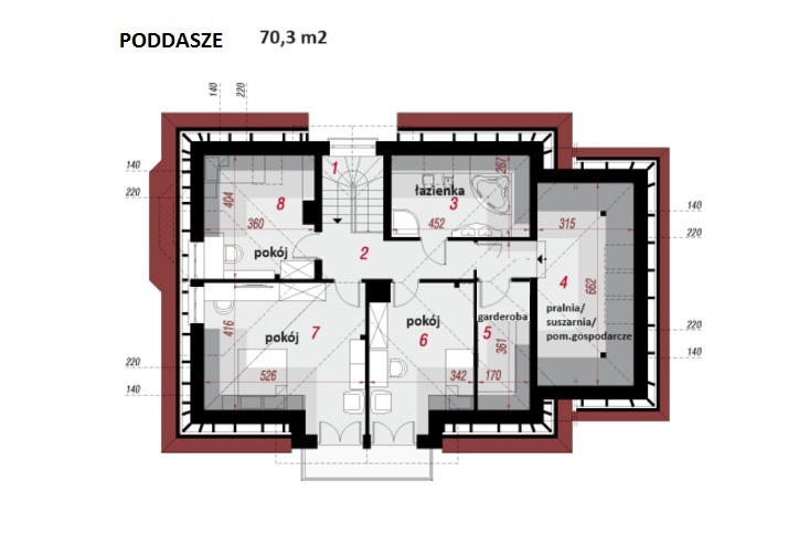 - poddasze: 3 pokoje sypialne łazienka z wanną, garderoba, (pralnia/suszarnia).