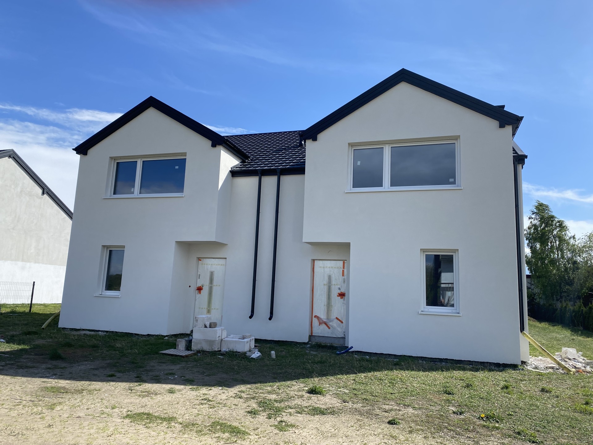 Budynki położone są na działkach o powierzchni 5 ar. Lokale energooszczędne z gazobetonu-solbet, ocieplone styropianem grafitowym 15cm +tynk akryl w kolorze białym. Okna trzyszybowe sześciokomorowe z roletami zewnętrznymi elektrycznymi. Dach pokryty blachodachówką.