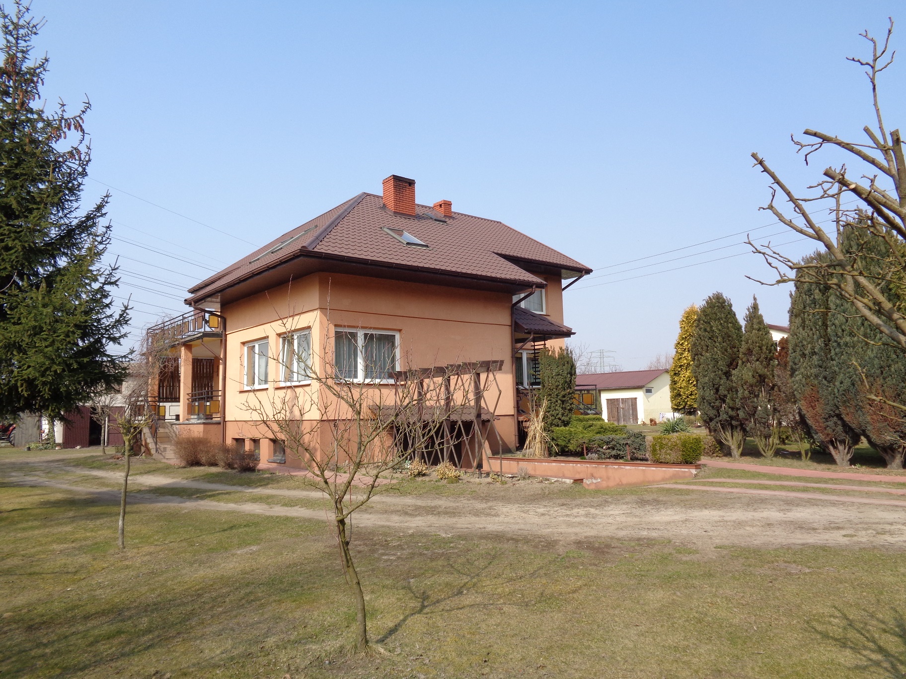 Sprzedam dom jednorodzinny w gminie Ślesin o pow. użytkowej około 147,5 m2 wraz z zabudowaniem gospodarczo-garażowym (trzy stanowiska garażowe). Działka o powierzchni 1,26 ha, zagospodarowana z licznymi nasadzeniami, drzewa owocowe i ozdobne, kostka brukowa, ogrodzona z trzech stron, brama elektryczna. Nieruchomość zlokalizowana w cichej i spokojnej okolicy, w pobliżu lasy, dwa jeziora, tereny rekreacyjne, plaża, ścieżka rowerowa. Idealna komunikacja: 3 km do Ślesina(szkoły, markety, sklepy, przychodnia, apteka, urząd), 13 do Konina. Dom wybudowany w 1990 roku z pustaka ceramicznego, na dachu blacha (wymiana dachu w 2008 roku), okna PCV, rolety zewnętrzne. Budynek całkowicie podpiwniczony z dużym i przestronnym strychem, garażem, zadaszonym tarasem i balkonem. Wyszczególnienie pomieszczeń: Parter: salon, jadalnia, sypialnia, kuchnia, łazienka, wiatrołap. Piętro: trzy pokoje, łazienka oraz pokój do własnej aranżacji. Na podłogach terakota i parkiet, ściany wytynkowane, pomalowane, glazura oraz boazeria. Instalacje: wod-kan i c.o., ogrzewanie węglowe. Przyłącza: woda, kanalizacja, prąd, siła, światłowód. Budynek gospodarczy: trzy garaże, pomieszczenia gospodarcze oraz duży strych. Dojazd do posesji drogą asfaltową.