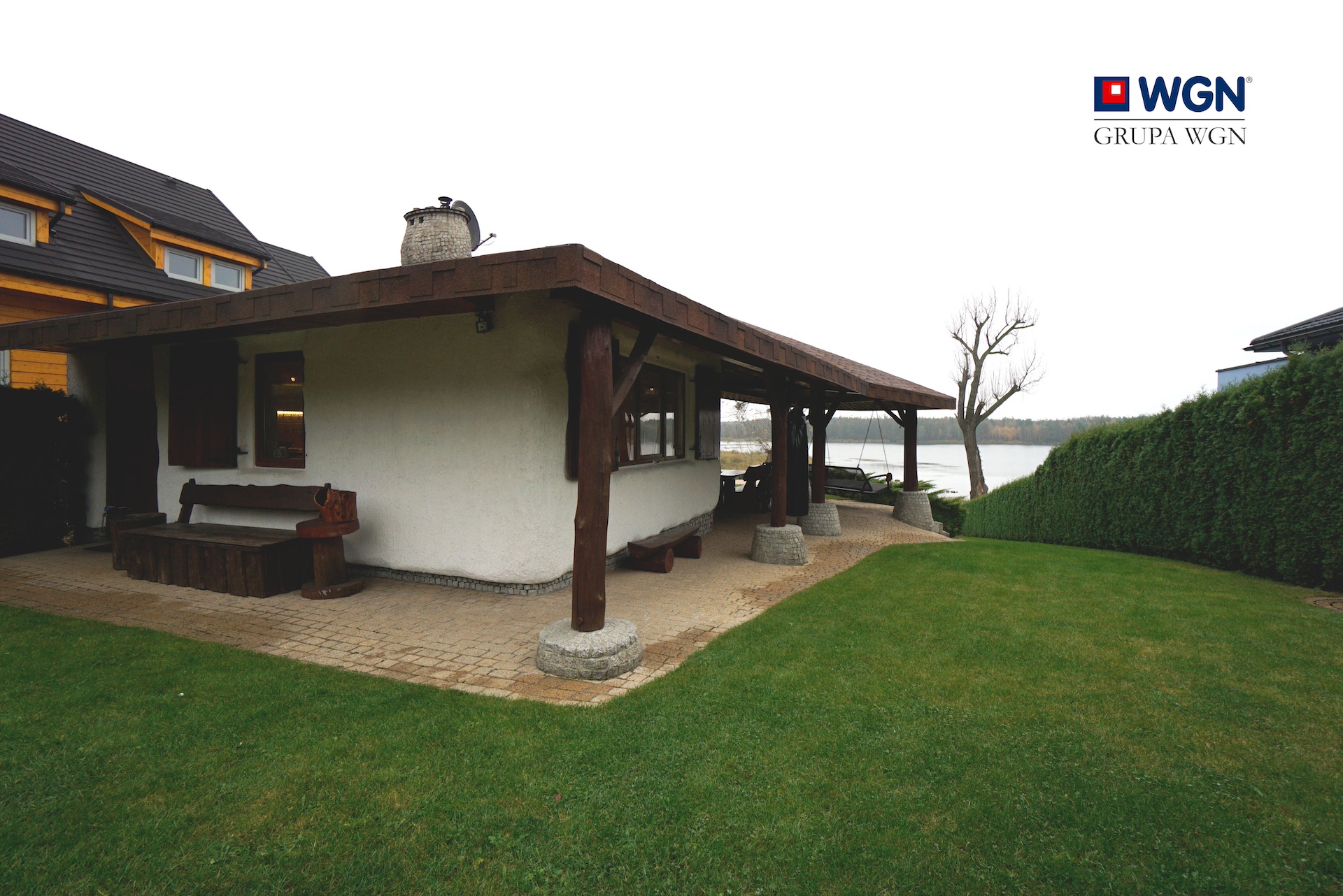 W skład nieruchomości wchodzą dwa budynki - mieszkalny z 2013 roku o powierzchni użytkowej 55 m2 z dużym tarasem oraz pięknym widokiem na jezioro.