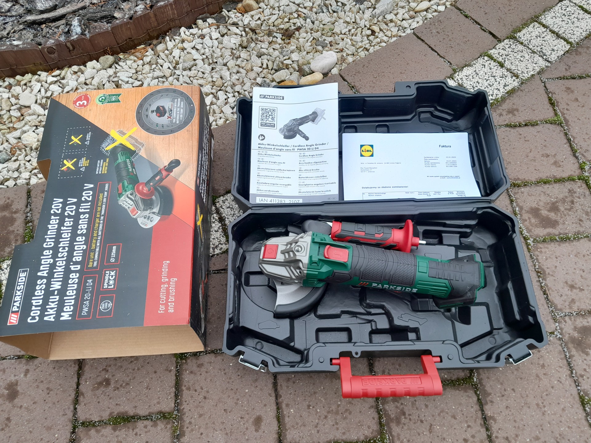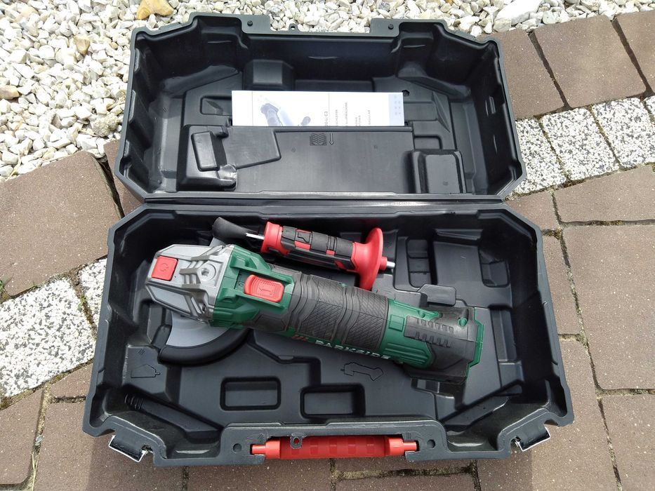 Sprzedam szlifierkę kątową akumulatorową firmy PARKSIDE PWSA 20-Li D4, 20 V. Szlifierka nowa na gwarancji producenta. W zestawie szlifierka, rękojeść, klucz do tarcz, osłona, instrukcja obsługi, walizka oraz dowód zakupu. Brak w zestawie akumulatora oraz ładowarki. Wielkość tarcz do fi 125mm. Zapraszam do zakupu.