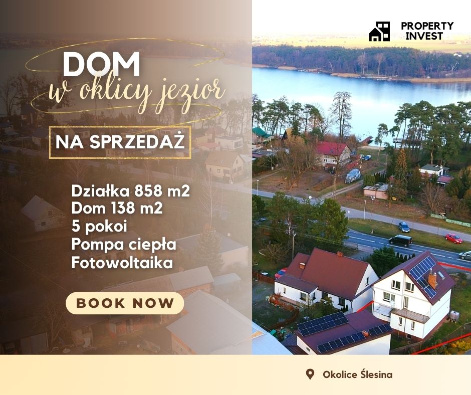 Sprzedam wolnostojący, funkcjonalny i przestronny dom jednorodzinny w gminie Ślesin o pow. użytkowej około 138 m2. Działka płaska o nieregularnym kształcie i powierzchni 858 m2, ogrodzona (siatką, ogrodzeniem z płyt betonowych oraz paneli ogrodzeniowych) i zagospodarowana (zieleń urządzona, nasadzenia krzewy i drzewa ozdobne oraz owocowe i kostka brukowa podjazd oraz dojście do budynku). Nieruchomość zabudowana piętrowym i podpiwniczonym domem jednorodzinnym z poddaszem użytkowym oraz wolnostojącym budynkiem garażowo/gospodarczym. Nieruchomość zlokalizowana wśród domków jednorodzinnych, oraz zabudowy zagrodowej i letniskowej w cichej i spokojnej okolicy. W pobliżu lasy, dwa jeziora (około 200 m i 800 m), tereny rekreacyjne, plaża, ścieżka rowerowa. Idealna komunikacja: 3 km do Ślesina (szkoły, przedszkole, markety, sklepy, przychodnia, apteka, poczta, banki, urząd), 16 do Konina, 37 km do Strzelna. Budynek gospodarczo/garażowy z użytkowym poddaszem, bez podpiwniczenia o powierzchni zabudowy 65 m2, wybudowany z pustaka i otynkowany, okna PCV, na dachu blachodachówka. Dom mieszkalny, jednorodzinny wybudowany w latach 80-tych wykonany w technologii tradycyjnej, murowanej, kryty dachem dwuspadowym z tarasem i dwoma balkonami. Fundamenty – ławy żelbetowe, ściany wykonane z pustaków, ocieplony wełną, elewacja wykończona Sidingiem kanadyjskim. Dach konstrukcja drewniana, ocieplony wełną mineralną, blachodachówka, okna PCV (trzy szybowe). Ogrzewanie: pompa ciepła firmy Panasonic. Wyszczególnienie pomieszczeń: Piwnica: pomieszczenia gospodarcze, techniczne i garaż jednostanowiskowy. Parter: salon z wyjściem na balkon, oddzielna jadalnia, kuchnia, łazienka z wanną, wc oraz korytarz i klatka schodowa. Piętro: trzy sypialnie w tym jedna z balkonem, łazienka z prysznicem oraz korytarz z wyjściem na taras. Poddasze użytkowe zgodnie z dokumentacją: dwa pokoje oraz strych. Na podłogach parkiet oraz terakota/gres, ściany tynki cementowo-wapienne malowane emulsją, glazura w korytarza