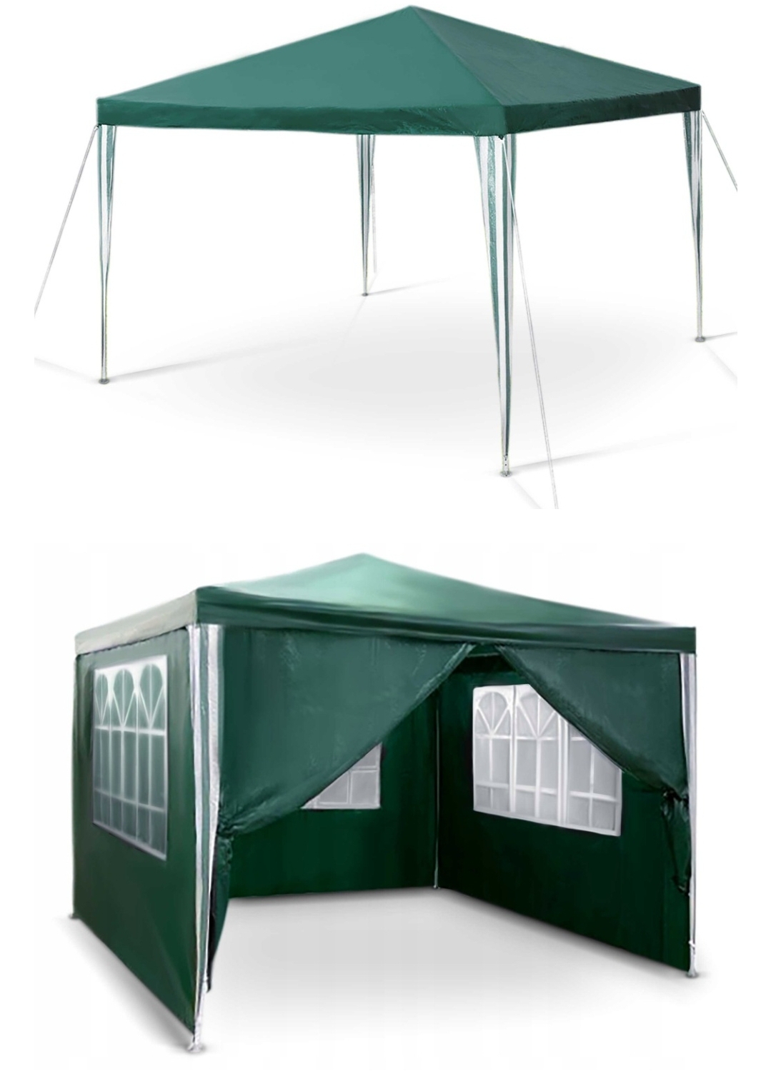 PAWILON NAMIOT OGRODOWY 3 x 3m + 4 ŚCIANKI BOCZNEPawilon ogrodowy z wodoodpornego polietylenu.Prosty w montażu. Odpowiedniej wytrzymałości elementy konstrukcyjne (średnica rurek - 2,5 cm; 1,9 cm) warunkują o stabilności pawilonu.Konstrukcja wykonana ze stali lakierowanej na kolor biały metodą proszkową.Odpowiedni podczas imprez plenerowych.Chroni przed słońcem, a w połączeniu z moskitierą - przed owadami.Skonstruowany z czterech ścian, umożliwiających niemal całkowite zamknięcie pawilonu.Każdą ze ścian można osobno przesuwać lub całkowicie zdjąć.Dane techniczne:wymiary całkowite: długość ok. 3 m; szerokość ok. 3 m; wysokość w najwyższym punkcie 2,5 mwysokość wejściowa: 2 mwymiary całkowite okna: szerokość 173 cm; wysokość 96 cmwymiary pojedynczego okienka: szerokość 56 cm, wysokość 96 cmmateriał: PE 110g/m2 wodoodpornystelaż: średnica 2,5 cm; 1,9 cmwaga: ok. 7 kgkolor: zielonyW zestawie:pawilon (dach, 4 ścianki, stelaż, zestaw mocujący = linki + śledzie)instrukcja montażu PL
