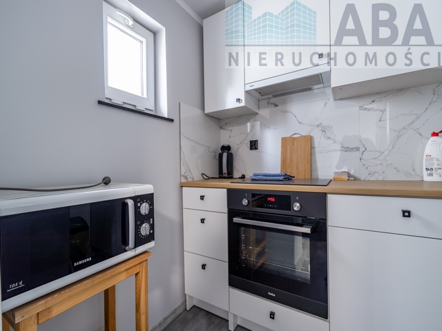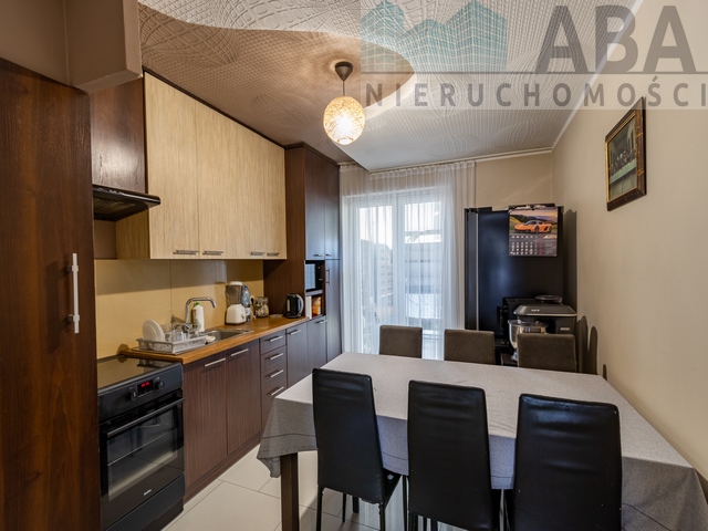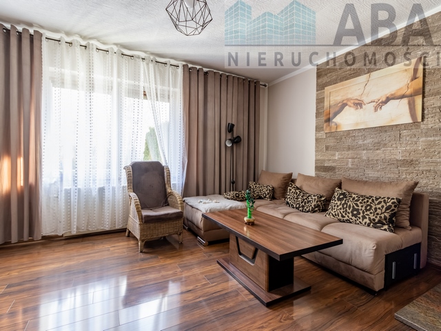 W łazienkach płytki na podłodze, ściany wyłożone glazurą, sufity malowane emulsją, prysznic. W korytarzu płytki na podłodze, na ścianie emulsja. W pokojach na ścianach i suficie emulsja, na podłodze panele, w salonie cegiełka. W kuchni płytki wzdłuż ciągu kuchennego, na podłodze płytki. Meble w zabudowie. Parapety z granitu. Drzwi wewnętrzne i zewnętrzne płycinowe. Na klatce schodowej boazeria drewniana.