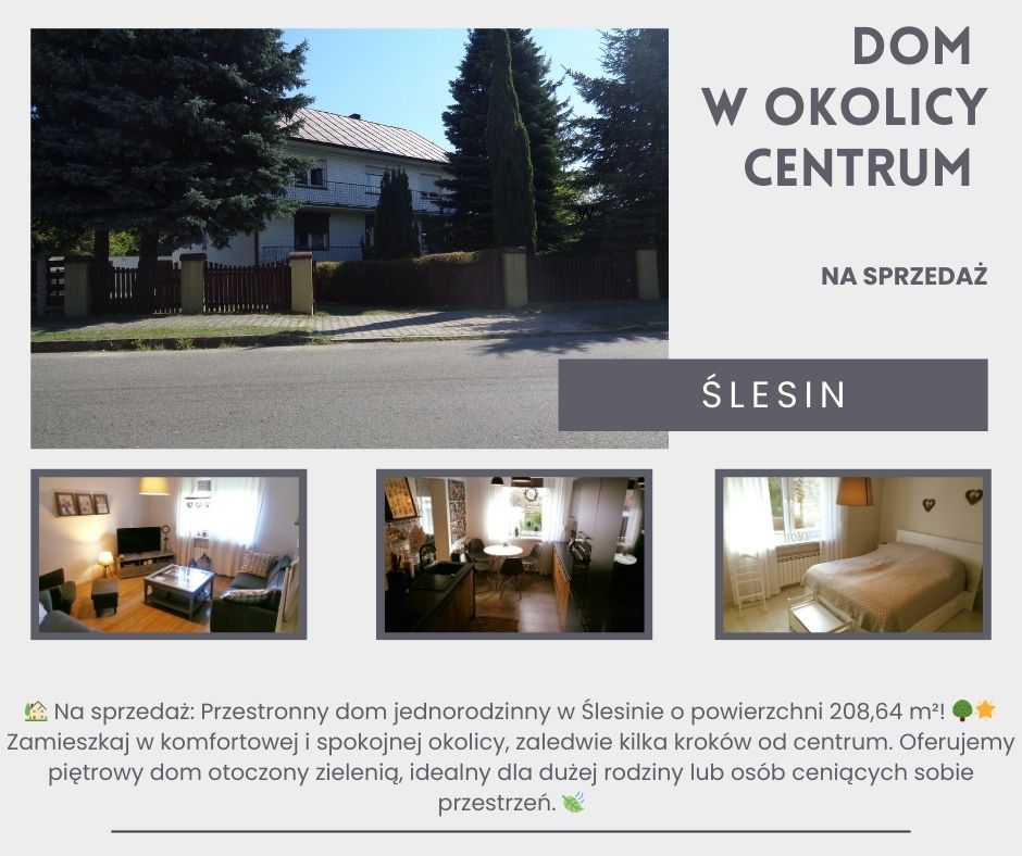 Sprzedam piętrowy dom jednorodzinny w Ślesinie o pow. użytkowej 208,64 m2. Działka o regularnym kształcie i powierzchni 20,32 ar, zabudowana wolnostojącym domem mieszkalnym oraz budynkiem garażowym o pow. zabudowy około 48 m2. Działka płaska, zagospodarowana (z licznymi nasadzeniami, drzewa i krzewy ozdobne, kostka) i ogrodzona (siatka oraz ogrodzenie betonowe). Nieruchomość zlokalizowana w pobliżu centrum miejscowości, wśród zabudowy jednorodzinnej i zagrodowej. Cicha i spokojna okolica, ciekawa lokalizacja nieruchomości oraz idealna komunikacją to bez wątpienia główne zalety nieruchomości. W najbliższej okolicy przystanek, urząd, centrum handlowe, apteka, poczta, banki, przychodnia, sklepy, markety, obiekty usługowe oraz inne obiekty użyteczności publicznej, szkoła podstawowa, dom kultury, plac zabaw, boisko „Orlik”, jezioro, tereny rekreacyjno-wypoczynkowe. Do Konina - 18 km, Skulsk - 14 km, Kleczew – 9 km, Sompolno -13 km. Dom mieszkalny z tarasem oraz dwoma balkonami, całkowicie podpiwniczony, z dużym i przestronnym strychem (możliwość adaptacji pod kolejne mieszkania). Układ funkcjonalny budynku umożliwia funkcjonowanie dwóch niezależnych stref lub dwóch osobnych rodzin z dodatkową możliwością niezależnych wejść do budynku. Budynek mieszkalny wolnostojący pobudowany pod koniec lat 80-tych z białej cegły i pustaka żwirowego z delatacją, ocieplony styropianem 6 cm oraz siding, okna częściowo PCV i drewniane, rolety zewnętrzne. Dach konstrukcja drewniana, deskowanie i blacha. Wyszczególnienie pomieszczeń: Piwnica: dwie kotłownie, cztery pomieszczenia gospodarcze, korytarz oraz składowisko na węgiel. Parter: wiatrołap z klatką schodową, korytarz, łazienka z prysznicem, kuchnia, salon połączony z jadalnią, trzy sypialnie, garderoba. Piętro: wiatrołap, korytarz, łazienka z prysznicem, kuchnia, salon połączony z jadalnią, trzy sypialnie, garderoba. Standard wykończenia: na podłogach terakota, panele, ściany wytynkowane i pomalowane, płytki. Mieszkania na parterze wyp