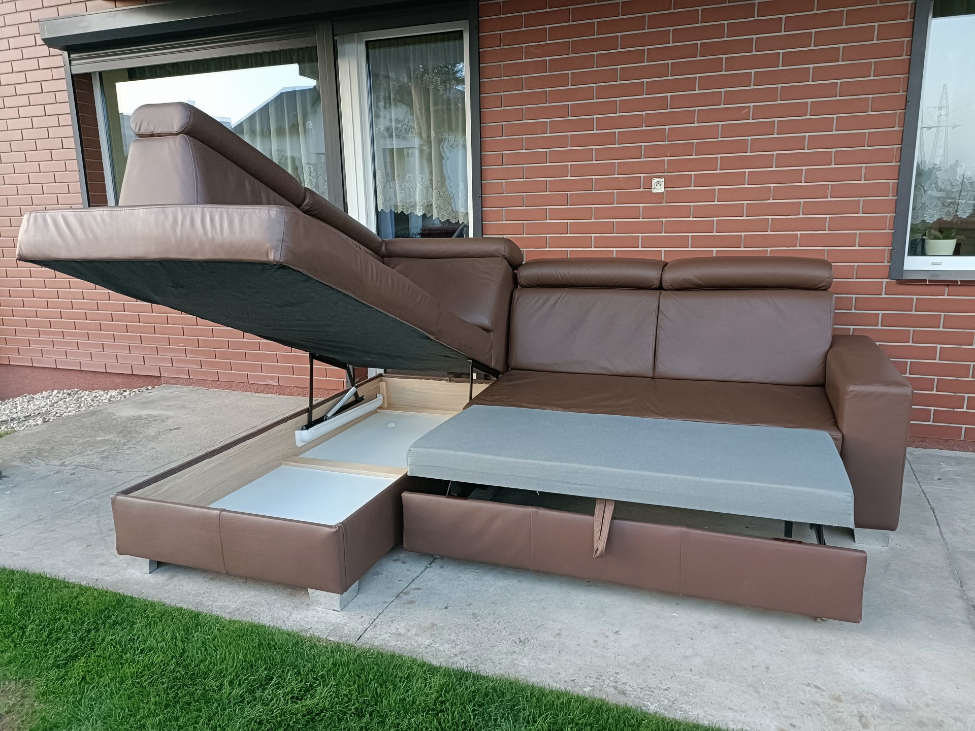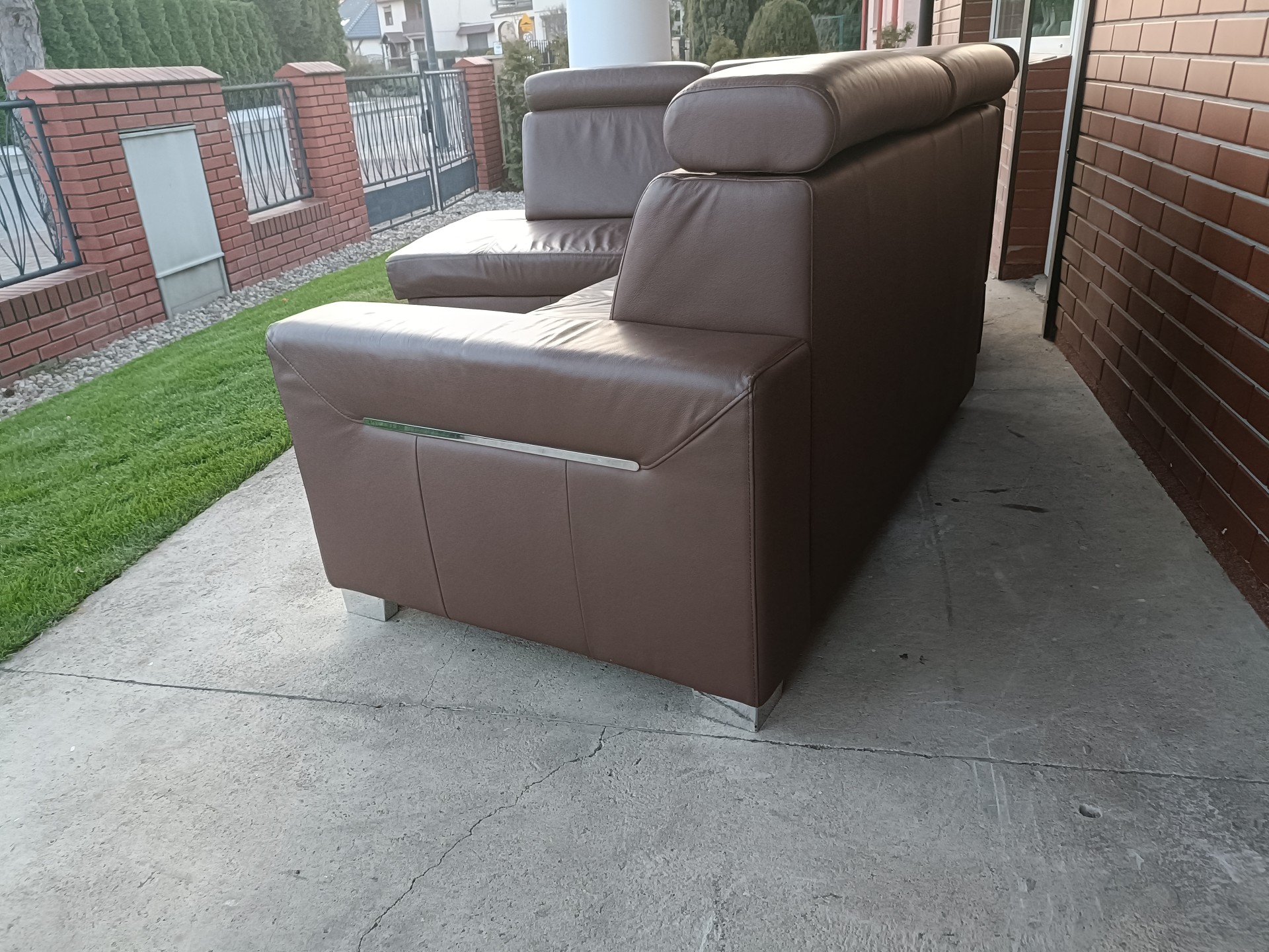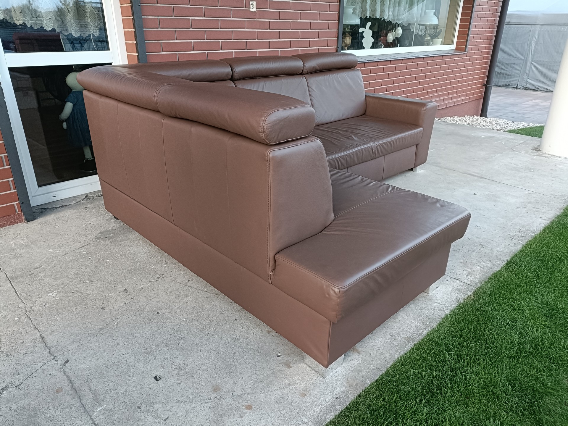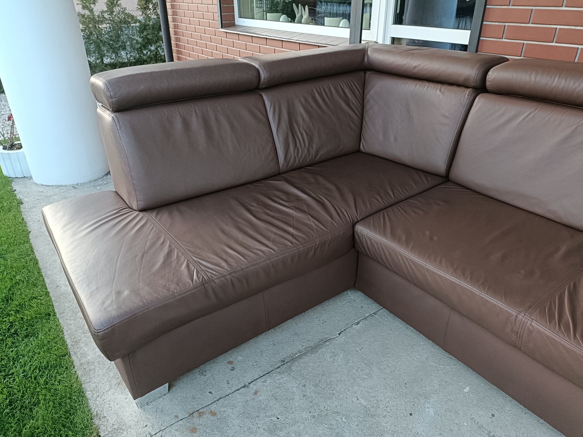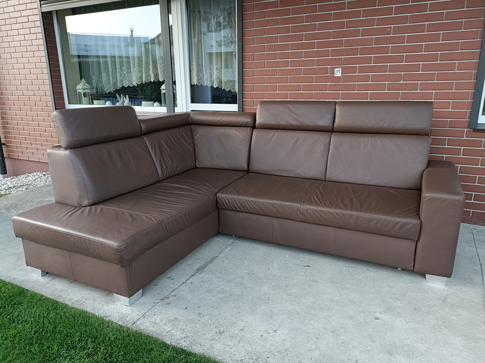 Sprzedam narożnik ze skóry kolor cappuccino wymiary 250 na 195 posiada funkcję spania, pojemnik na pościel i regulowane zagłówki, stan bdb