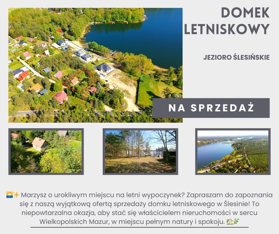 Sprzedam bardzo atrakcyjną nieruchomość w świetnej lokalizacji. Domek letniskowy zlokalizowany w gminie Ślesin w drugiej linii brzegowej jeziora ślesińskiego. Region potocznie nazywany Wielkopolskimi Mazurami zlokalizowany w centralnej Polsce z idealną komunikacją z większymi aglomeracjami: Kalisz – 70 km, Toruń – 90 km, Poznań, Bydgoszcz – 100 km, Łódź – 120 km. Działka płaska o regularnym kształcie i powierzchniach 10,93 ara zabudowana domkiem letniskowym. Nieruchomość przeznaczona w miejscowym planie zagospodarowania przestrzennego pod zabudowę rekreacyjną. Działka ogrodzona siatką i zagospodarowana: drzewa i krzewy ozdobne. Cicha, spokojna i urokliwa okolica o niepowtarzalnych walorach przyrodniczych, ciekawa lokalizacja nieruchomości oraz idealna komunikacja to bez wątpienia główne zalety nieruchomości. W najbliższym sąsiedztwie jezioro ślesińskie, lasy, ogólnodostępna plaża, tereny rekreacyjno-wypoczynkowe oraz zabudowa letniskowa. Do centrum Ślesina (szkoła podstawowa, przedszkole, żłobki, plac zabaw, boisko „Orlik”, sklepy, markety, przychodnia, apteka, poczta, banki, obiekty usługowe, inne obiekty użyteczności publicznej, tereny rekreacyjno-wypoczynkowe, stadion, „Marina”, tężnie, park oraz ścieżki rowerowe) 3 km. Do Konina - 21 km, Skulsk - 12 km, Kleczew - 11 km, Sompolno -15 km. Dwukondygnacyjny domek o powierzchni zabudowy 62 m2 (powierzchnia użytkowa około 80 m2) z balkonem oraz widokiem na jezioro ślesińskie. Budynek murowany i ocieplony, dach pokryty blachodachówką, okna PCV. Parter domu stanowi część dzienną budynku i składa się łazienki z prysznicem i wc, jasnego, funkcjonalnego i przestrzennego salonu z umeblowanym aneksem kuchennym, gabinetu, kotłowni na piec węglowy, korytarza i klatki schodowej. Poddasze użytkowe z kolei stanowi część sypialnianą budynku i składa się z korytarza, trzech sypialni w tym dwie z balkonem i otwartej antresoli. Standard wykończenia parteru: na podłogach terakota, ściany wytynkowane i pomalowane oraz płytki, schody dr