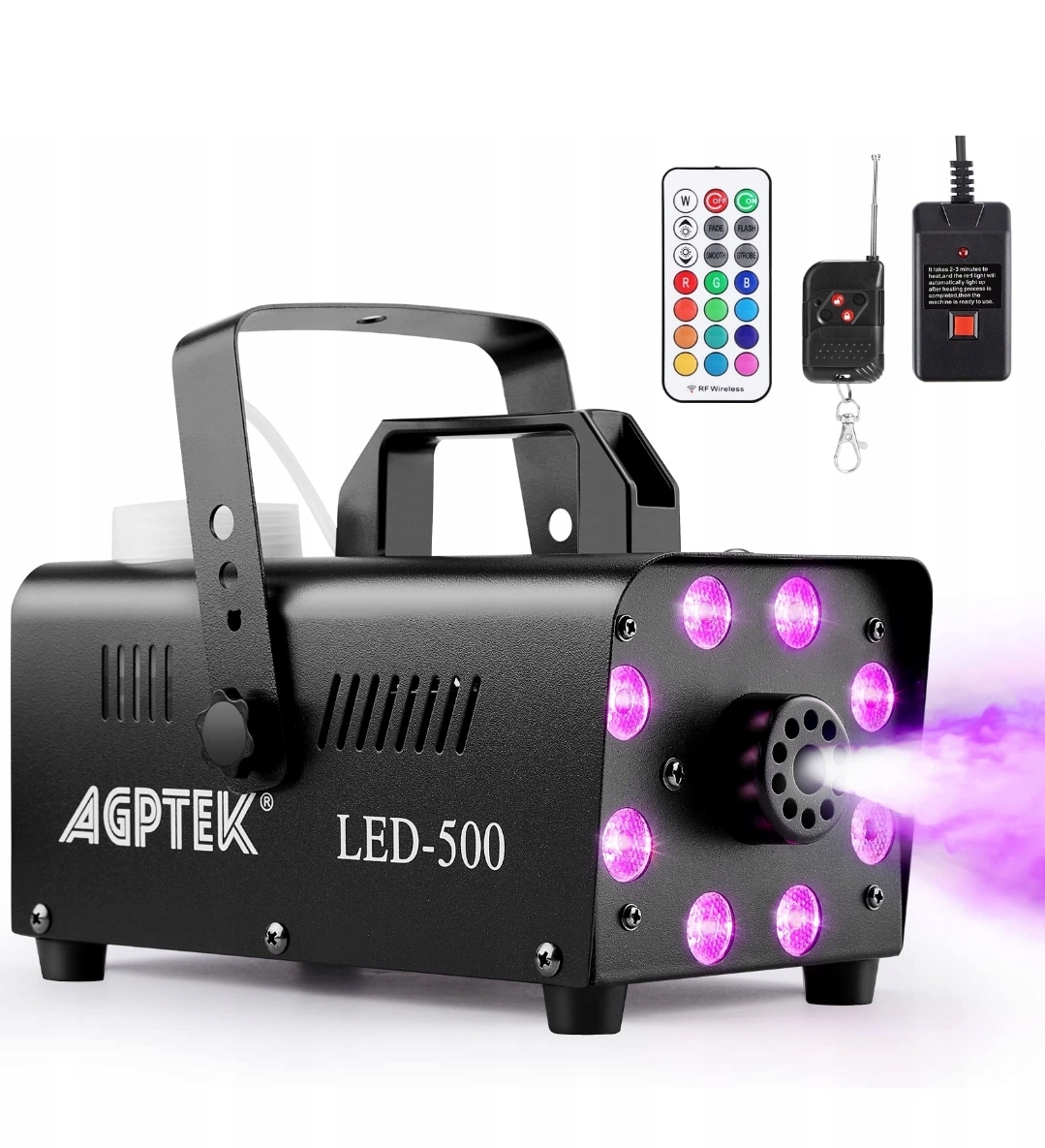 AGPtEK maszyna do dymu z 13 kolorowymi diodami LED i efektem RGB, 500 W i 2000 CFM z 2 przewodowymi i radiowymi pilotami, idealna na wesela, Halloween i pokazy sceniczne