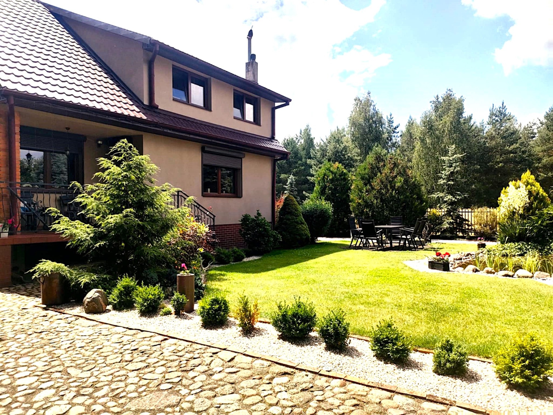Teren wokół domu z licznymi nasadzeniami, oczkiem wodnym oraz BALIĄ OGRODOWĄ !!!!