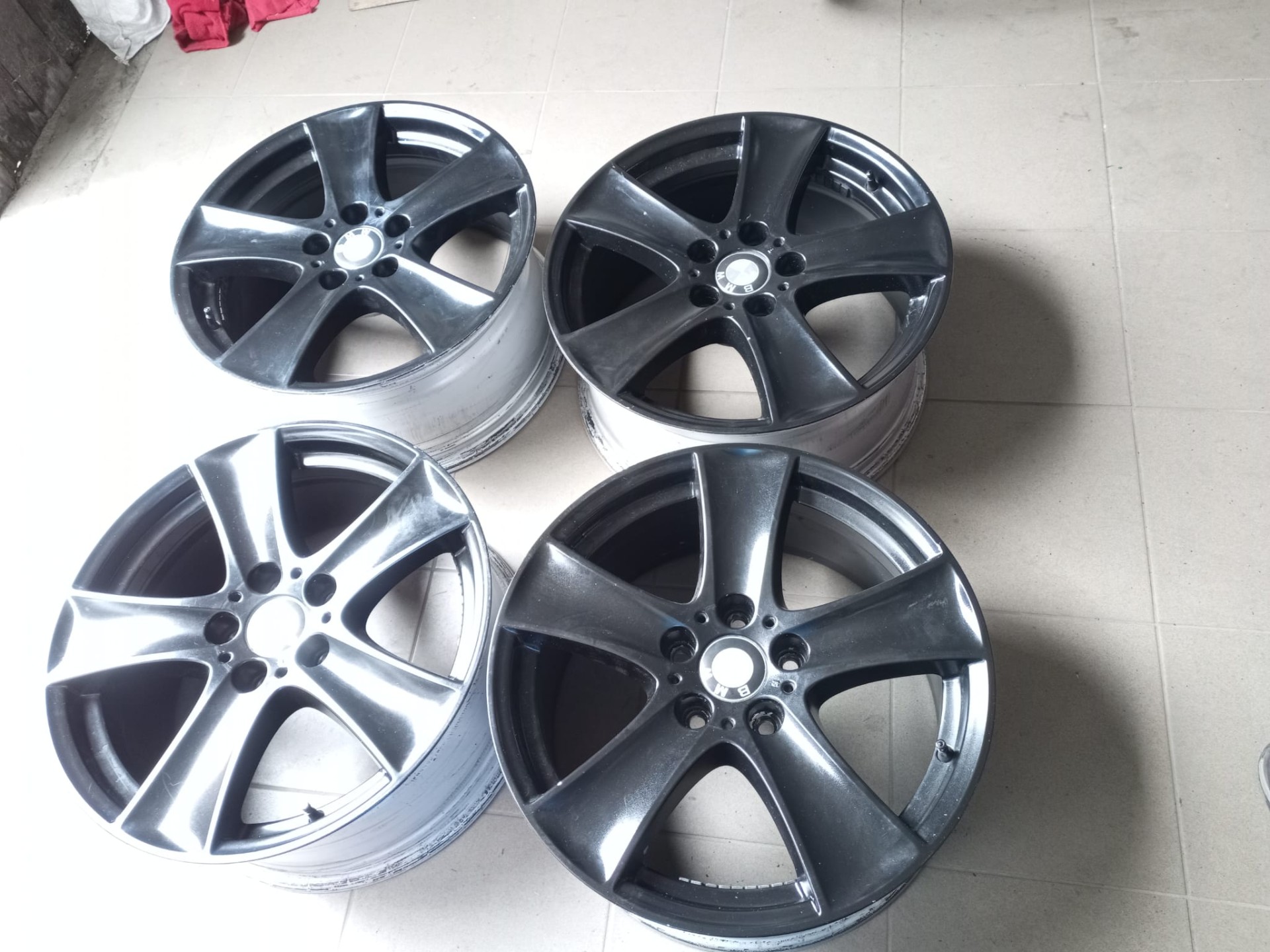 Felgi aluminiowe do odnowienia ponieważ były przemalowane z koloru srebrnego na czarny. Wszystkie felgi są proste sprawdzone na wyważarce bez ubytków aluminium.