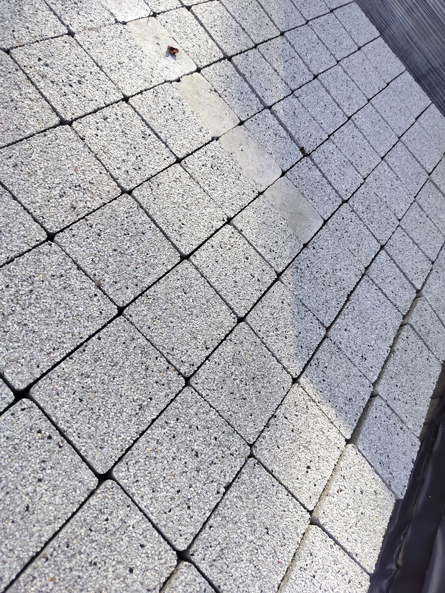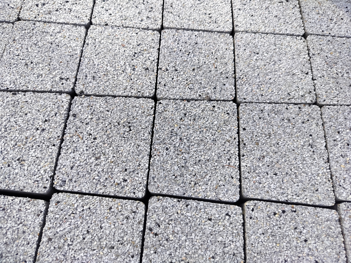 Kostka trapezowa o grubość 6cm LOGO, kolor: sjenit (szare kruszywo szlachetne). Producent: BRUK-BET.