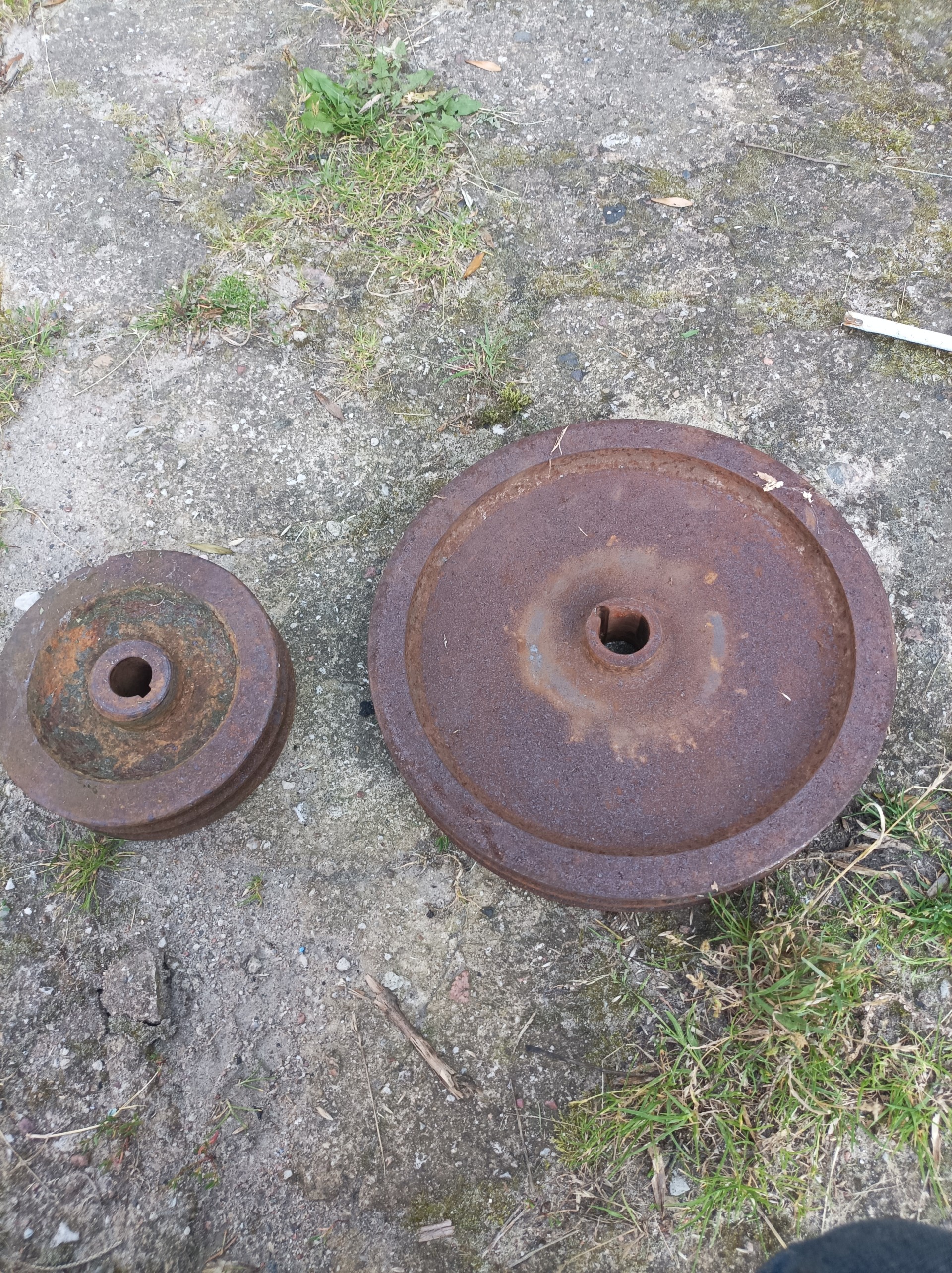 Sprzedam koła pasowe . Duże średnica 31 cm. otwór na wałek 3 cm. Małe średnica 17.5 cm. otwór na wałek 2.5 cm.