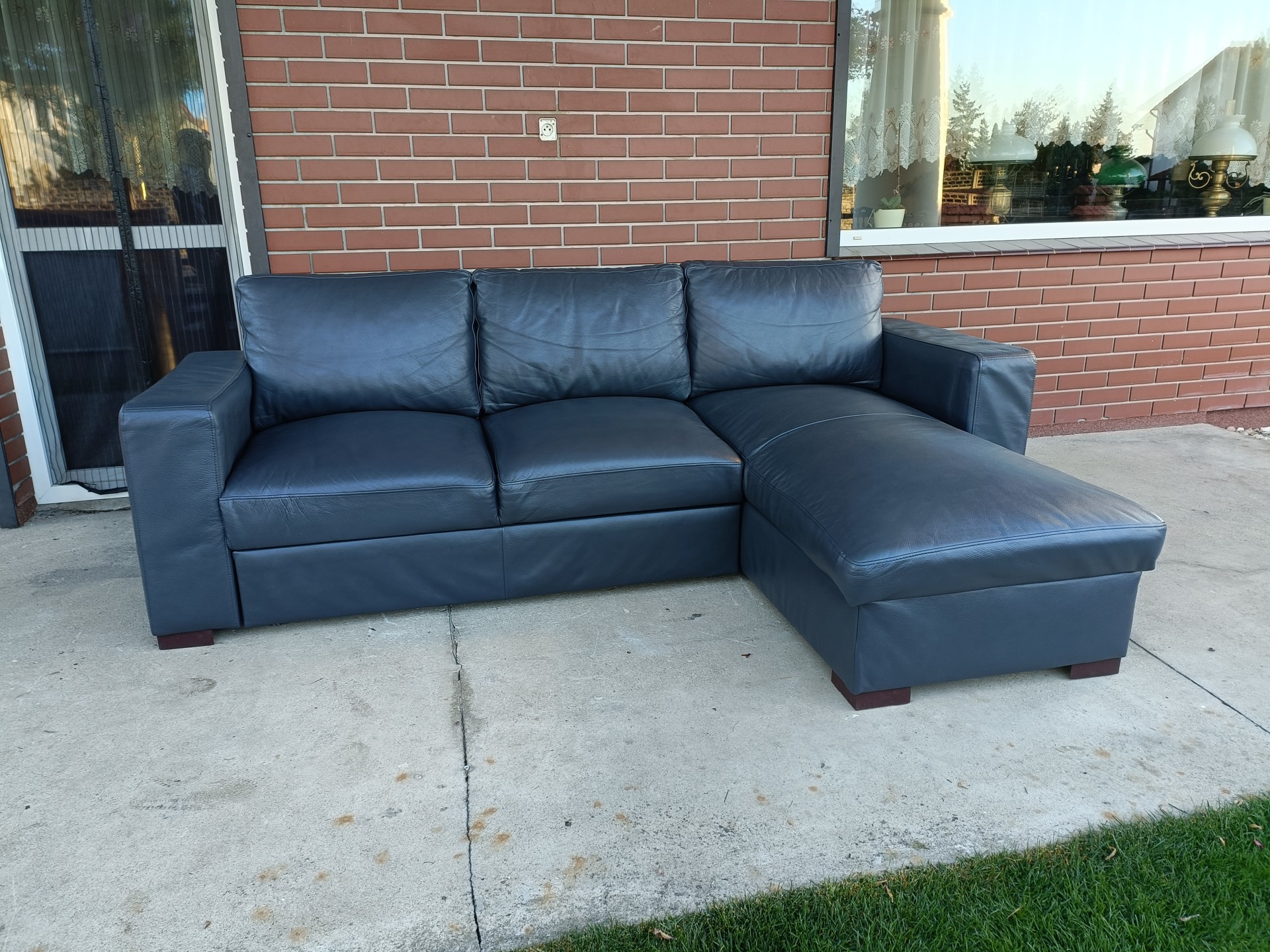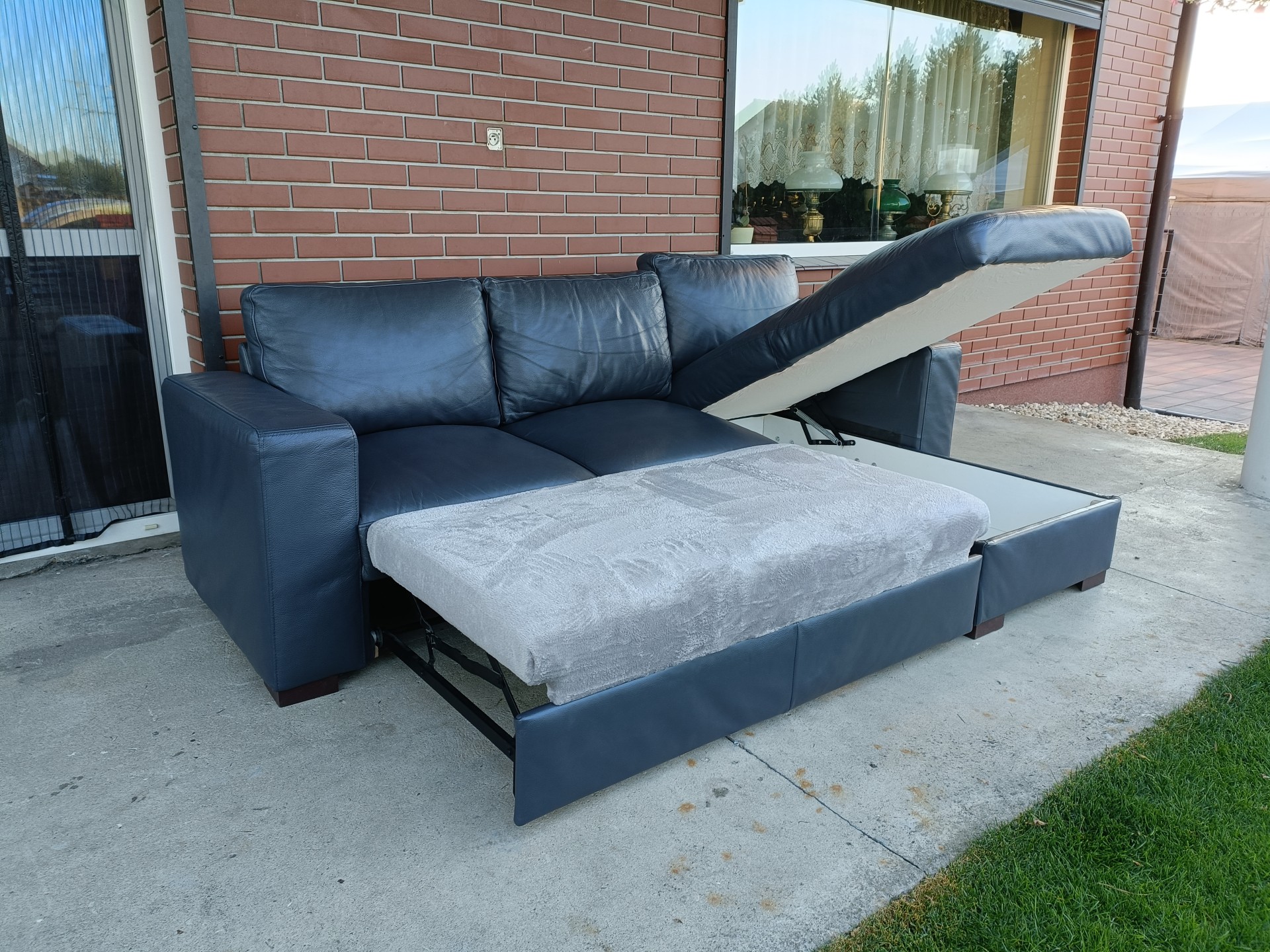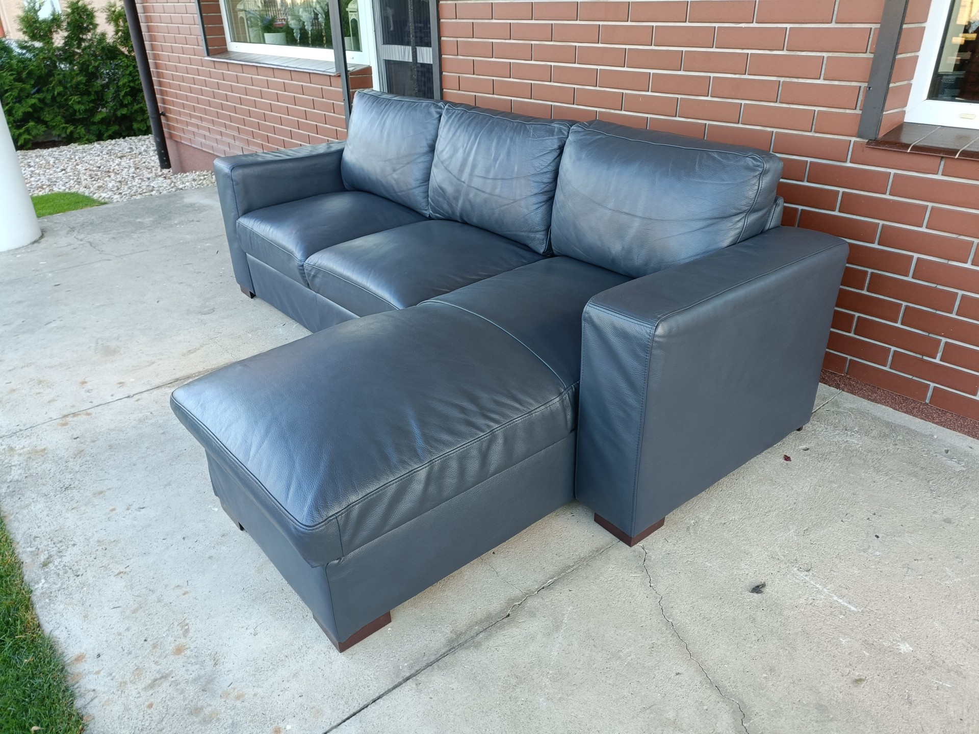 Sprzedam narożnik ze skory kolor ciemny popiel wymiary 250 na 160 narożnik posiada funkcje spania i pojemnik na pościel, możliwość zamiany stron stan bdb