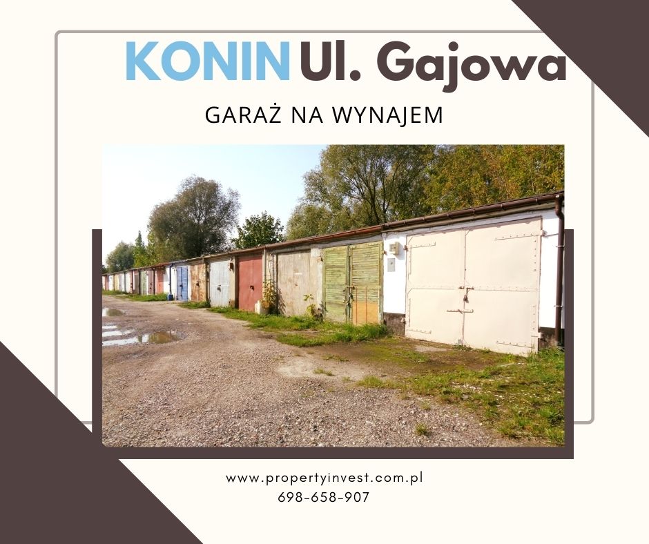 Wynajmę garaż o powierzchni około 19 mkw w Koninie przy ul. Gajowej. Garaż z dogodnym dojazdem, teren ogrodzony. Budynek z monitoringiem w sąsiedztwie, murowany na dachu papa, solidne i dobrze zabezpieczone drzwi, instalacja elektryczna.