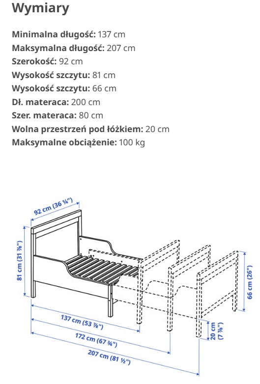 Rosnące łóżko 3 wymiary z materacem, 90 x na max.207 cm