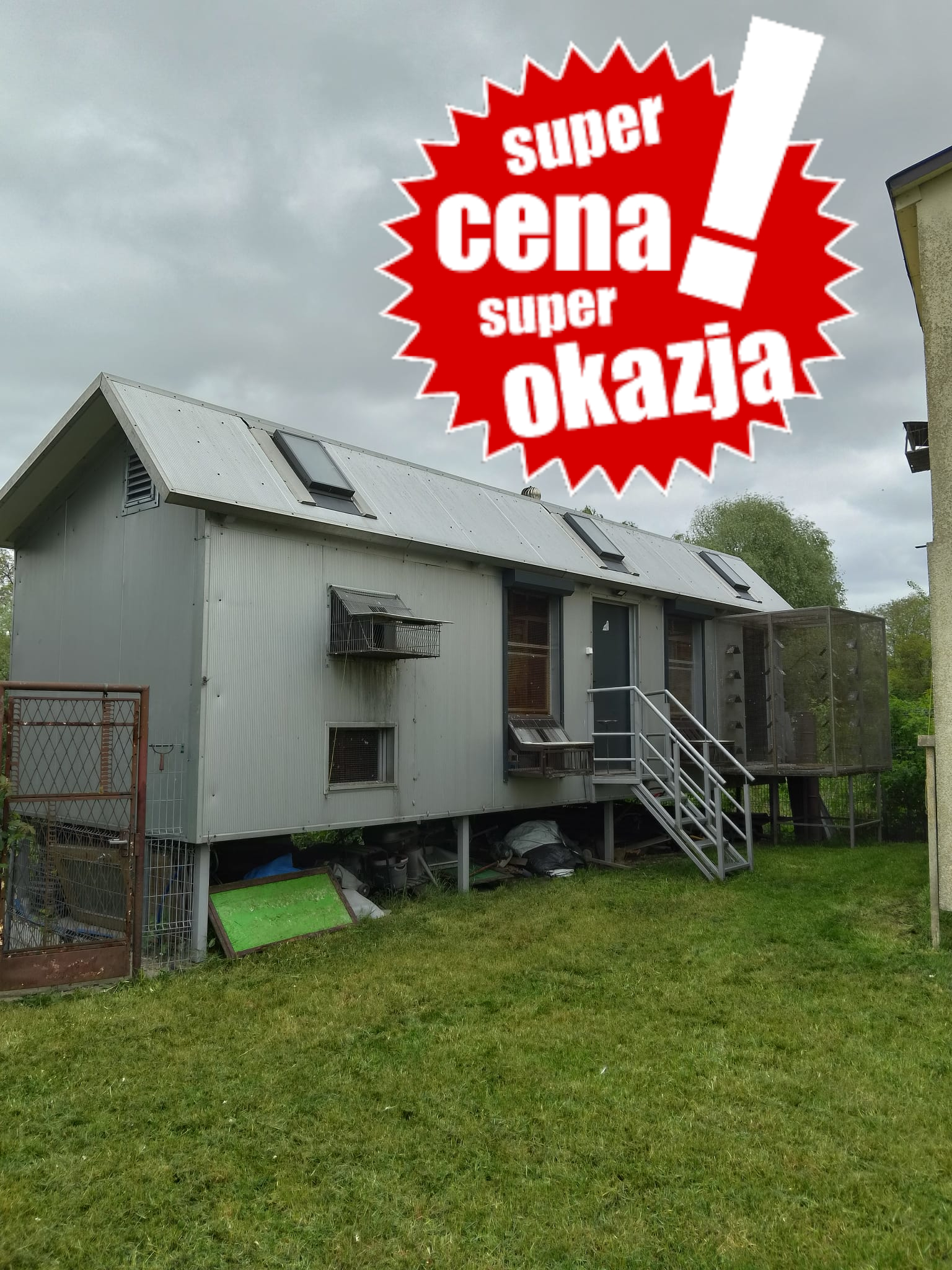 Na sprzedaż oferuję solidny, ocieplany gołębnik z wolierą zewnętrzną. Gołębnik o wymiarach 10 m długości, 3,35 m szerokości i ok. 3,5 m wysokości (do szczytu dachu). Konstrukcja wykonana z płyt o grubości 10 cm z rdzeniem ze styropianu, co zapewnia doskonałą izolację cieplną – idealne warunki dla gołębi przez cały rok.