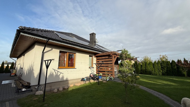 Dom wyposażony jest w pompę ciepła o mocy 9 kW, instalację fotowoltaiczną 6,6 kW oraz zbiornik na ciepłą wodę użytkową o pojemności 200 litrów.
