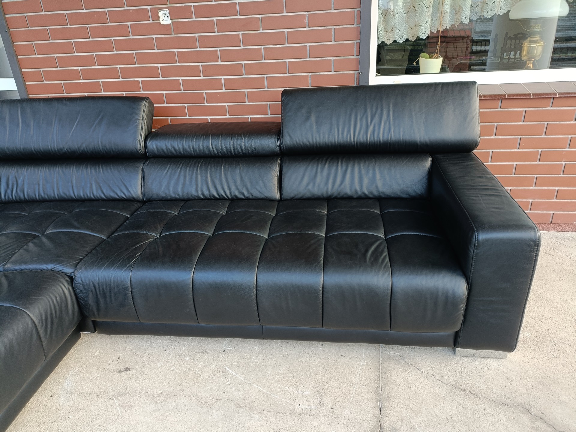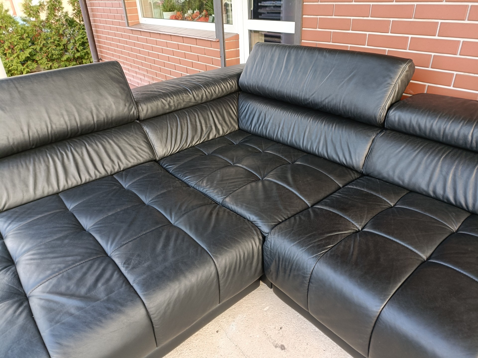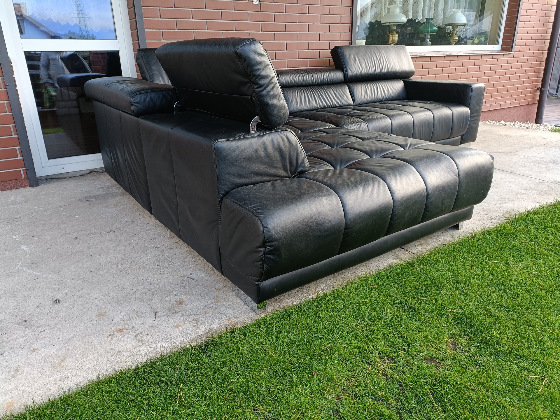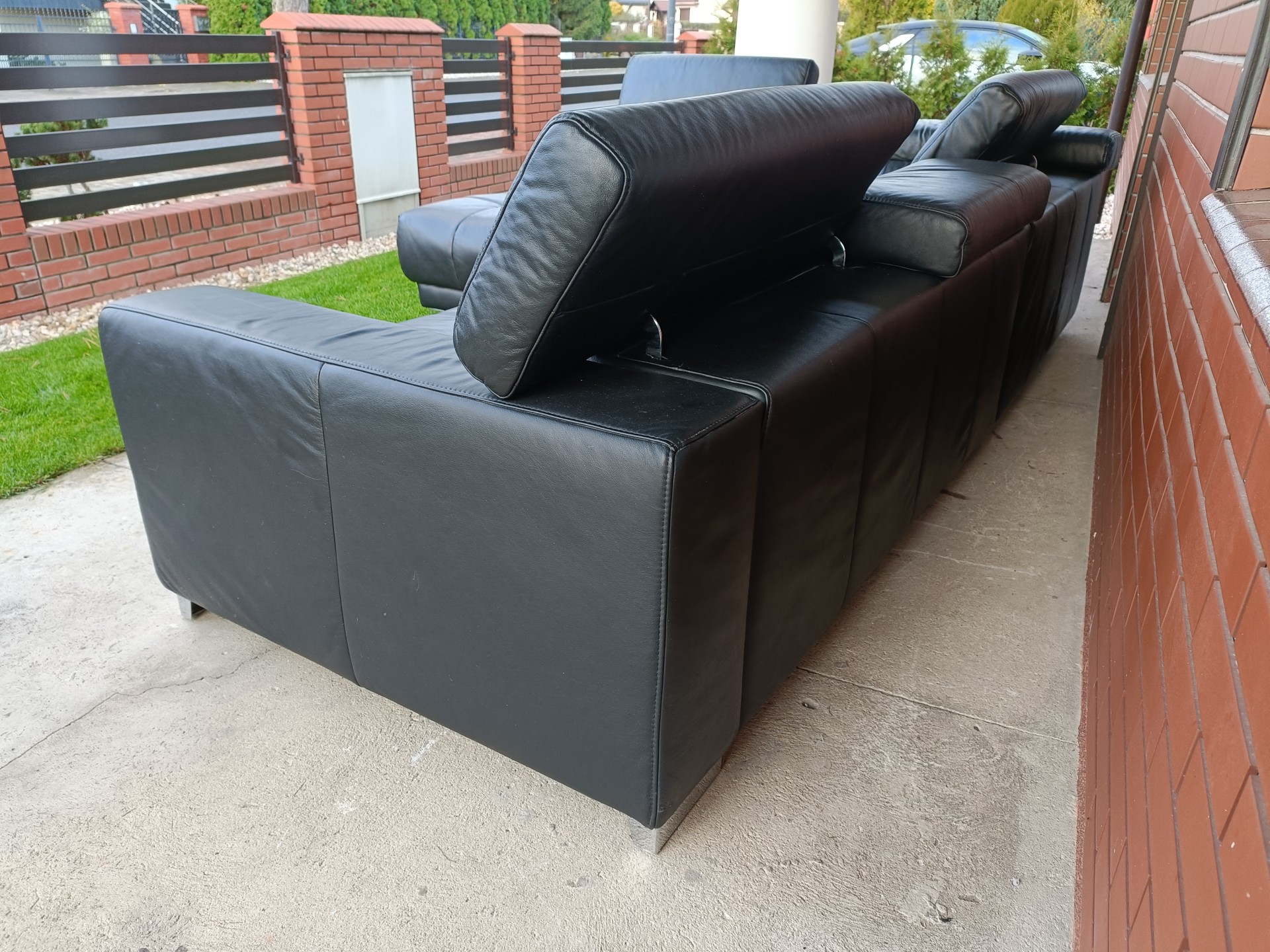 Sprzedam narożnik ze skóry z kolor czarny wymiary 310 na 225 posiada regulowane zagłówki nie posiada funkcji spania stan bdb