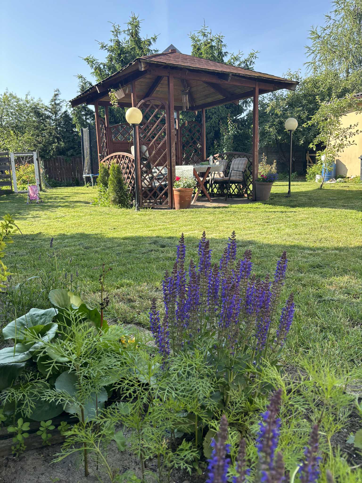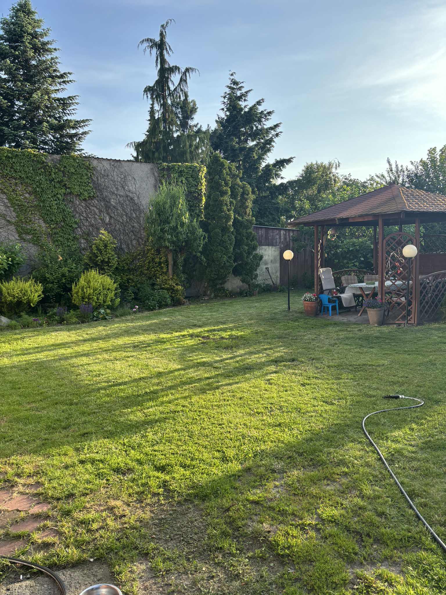 Balkon z widokiem na duży zielony ogród, w którym wybudowana jest altana oraz taras od strony wschodniej. Brak bliskości domów z tyłu i przodu powoduje wrażenia dużej przestrzeni.