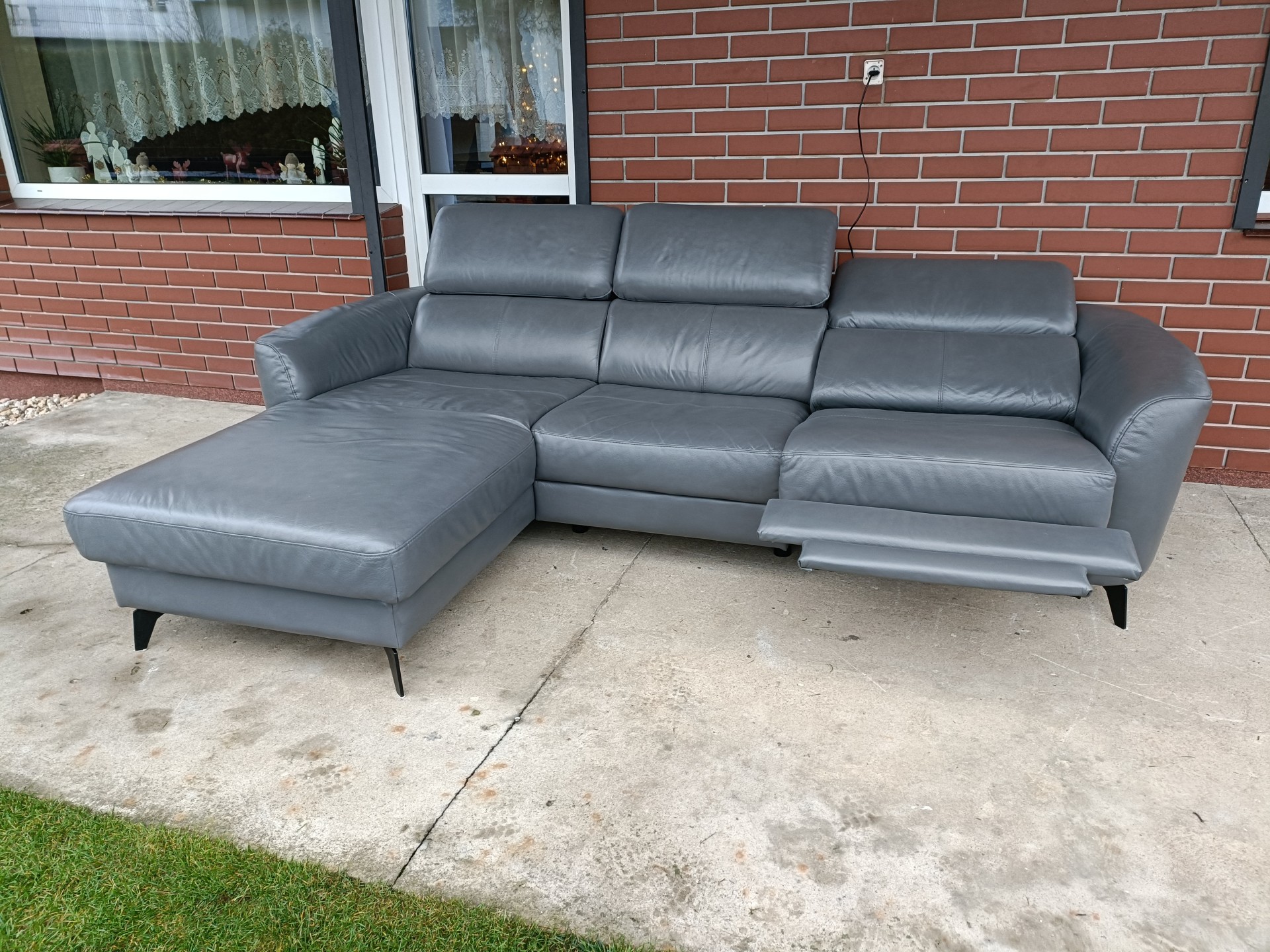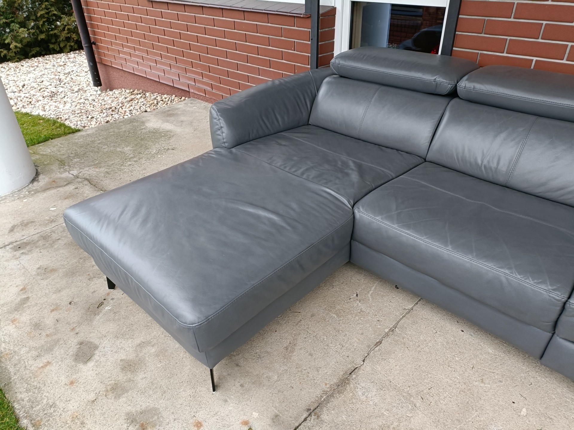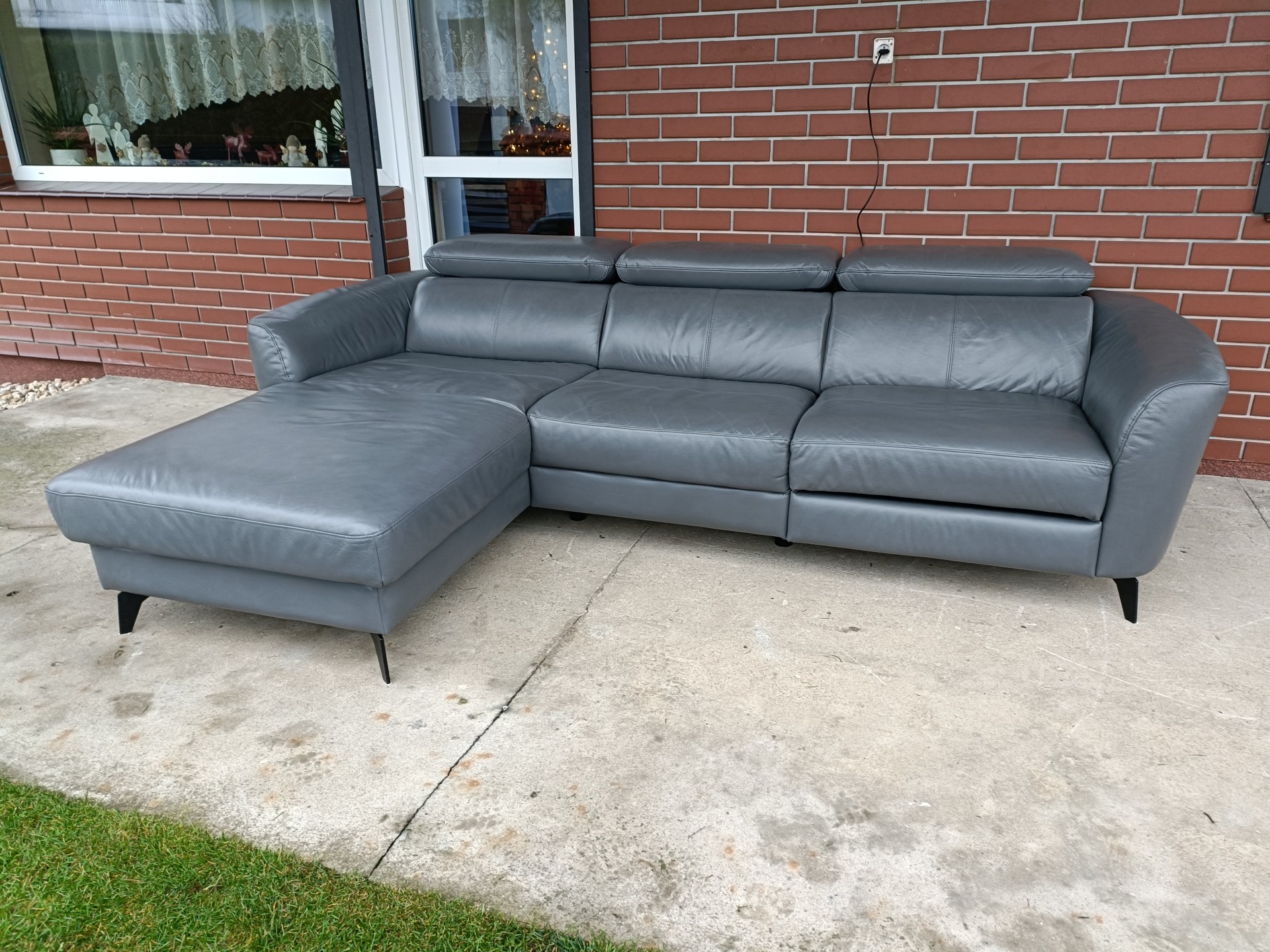 Sprzedam narożnik ze skóry kolor ciemny popiel wymiary 255 na 175 narożnik posiada elektryczną funkcję relaks i regulowane zagłówki nie posiada funkcji spania stan bdb