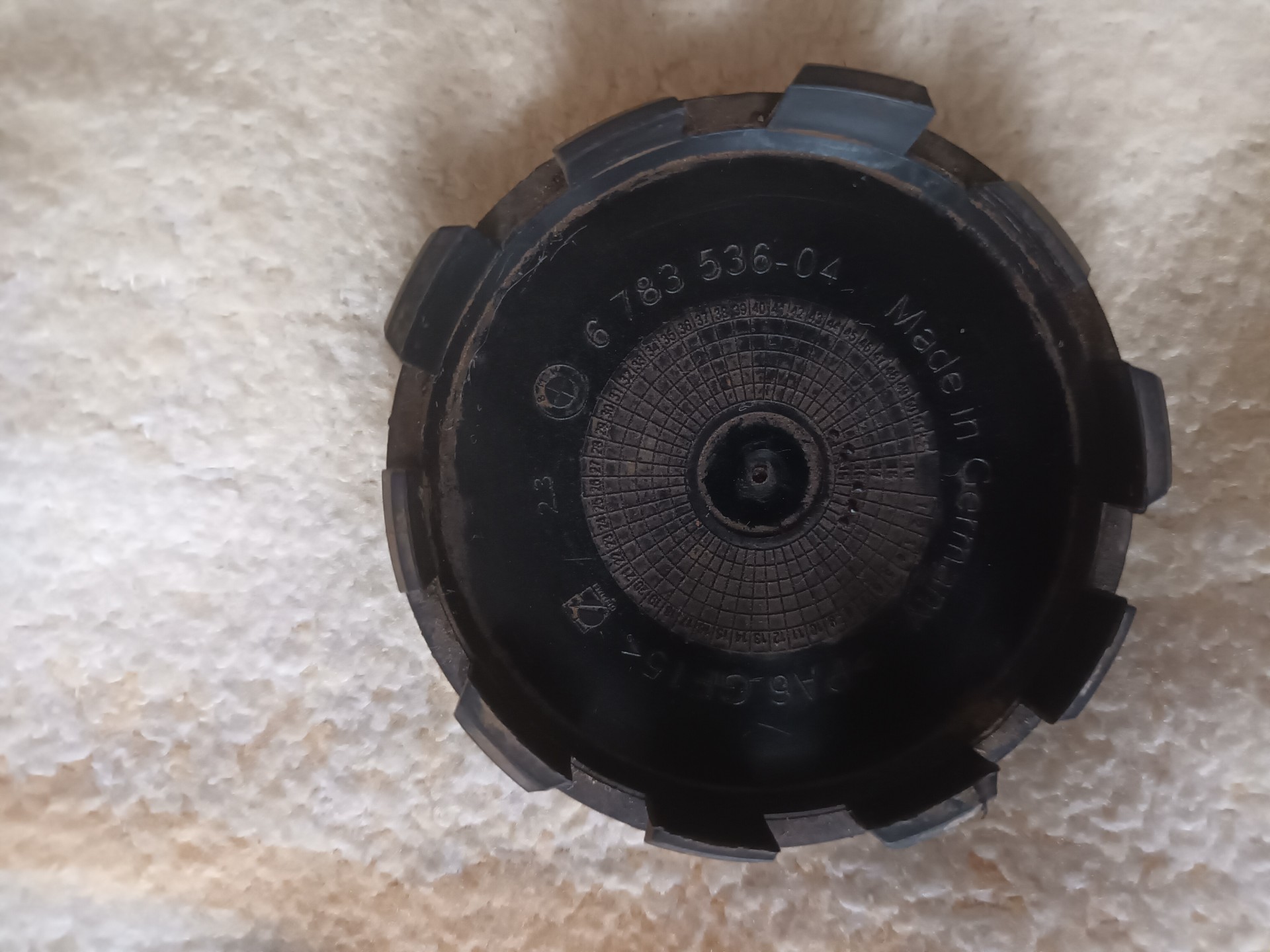 Widoczny element to dekielek (kapselek, zaślepka) do felgi aluminiowej marki BMW. Służy do zakrywania otworu centralnego piasty koła. Cena 50 złotych.