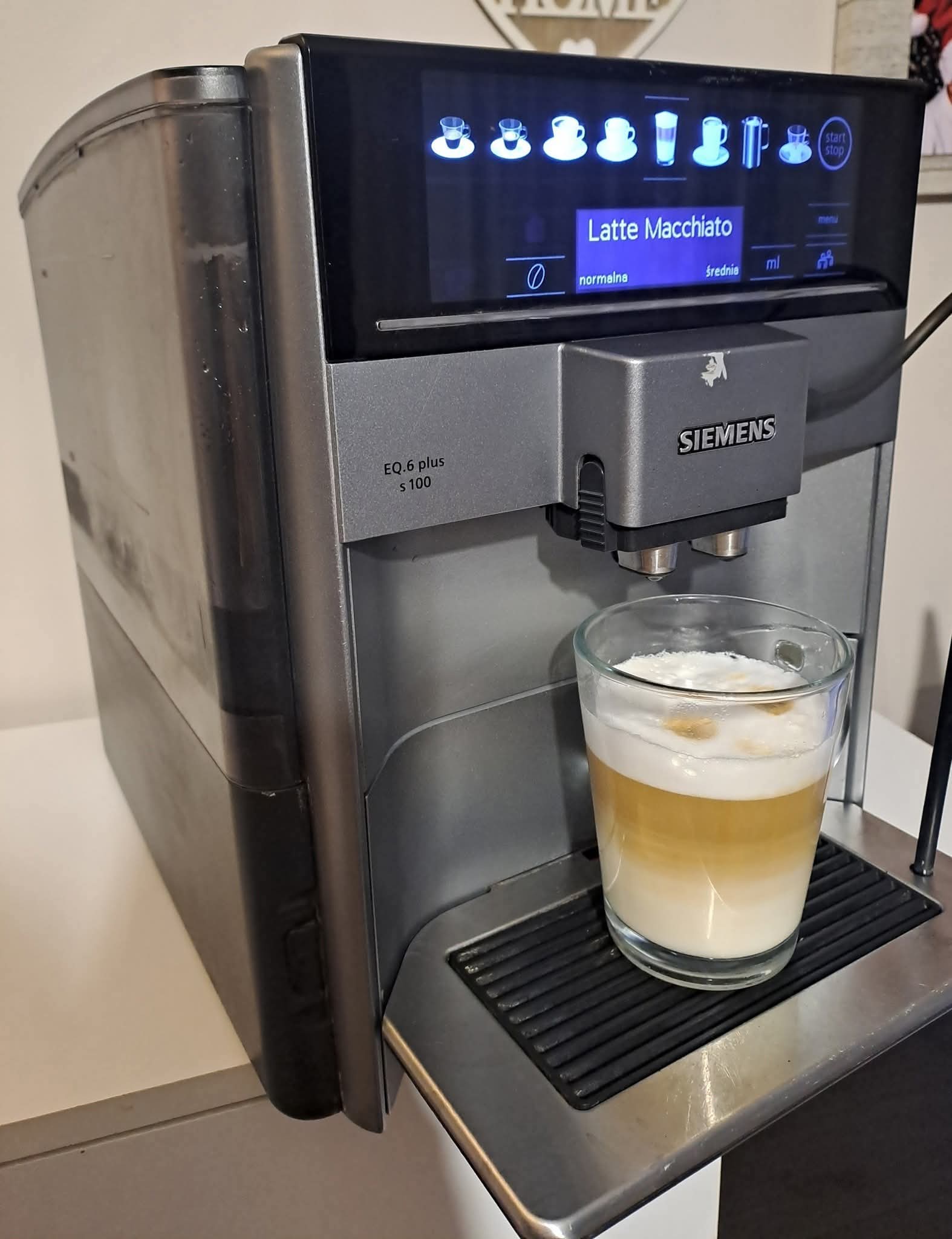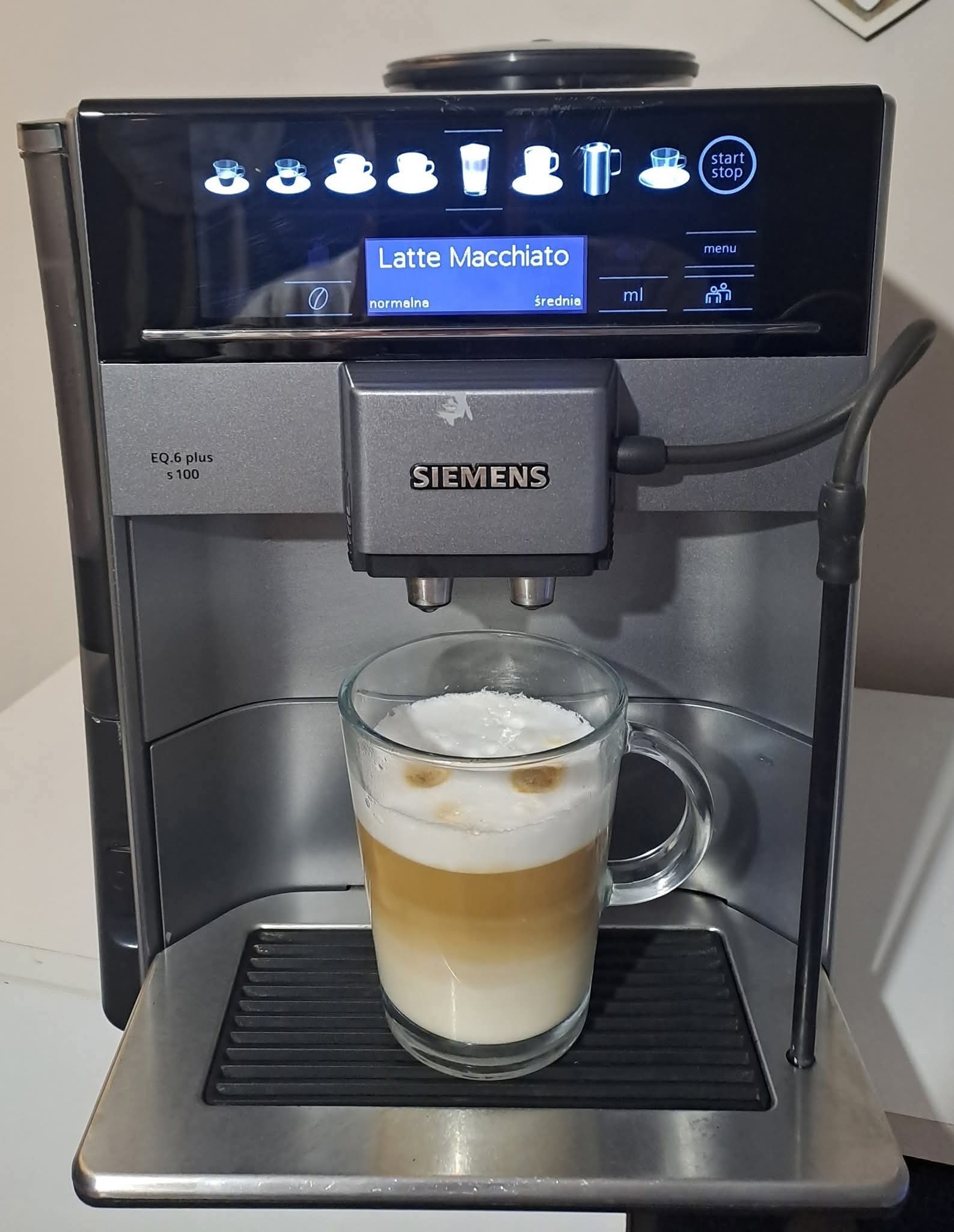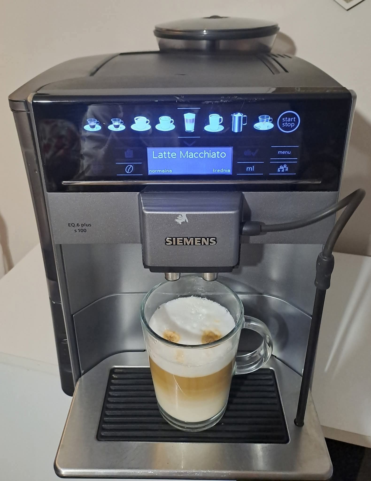 Sprzedam ekspres ciśnieniowy firmy Siemens eQ6 plus serie 100. Młynek ceramiczny. Sterowanie elektroniczne. Rodzaj kawy mielona/ziarnista. Dostępne napoje do wyboru : cappucino, espresso, macchiato, espresso z mlekiem, gorące mleko, herbata, kawa czarna, latte. Automatyczne płukanie przewodu mlekowego. Automatyczny program odkamieniania i czyszczenia. Opcja zaparzania dwóch kaw jednocześnie. Wskaźnik poziomu wody. Regulacja temperatury/mocy kawy. Blokada przed dziećmi. Ekspres w stanie bardzo dobrym (jedyna wada widoczna na zdjeciu ryska na obudowie stąd też niższa cena).