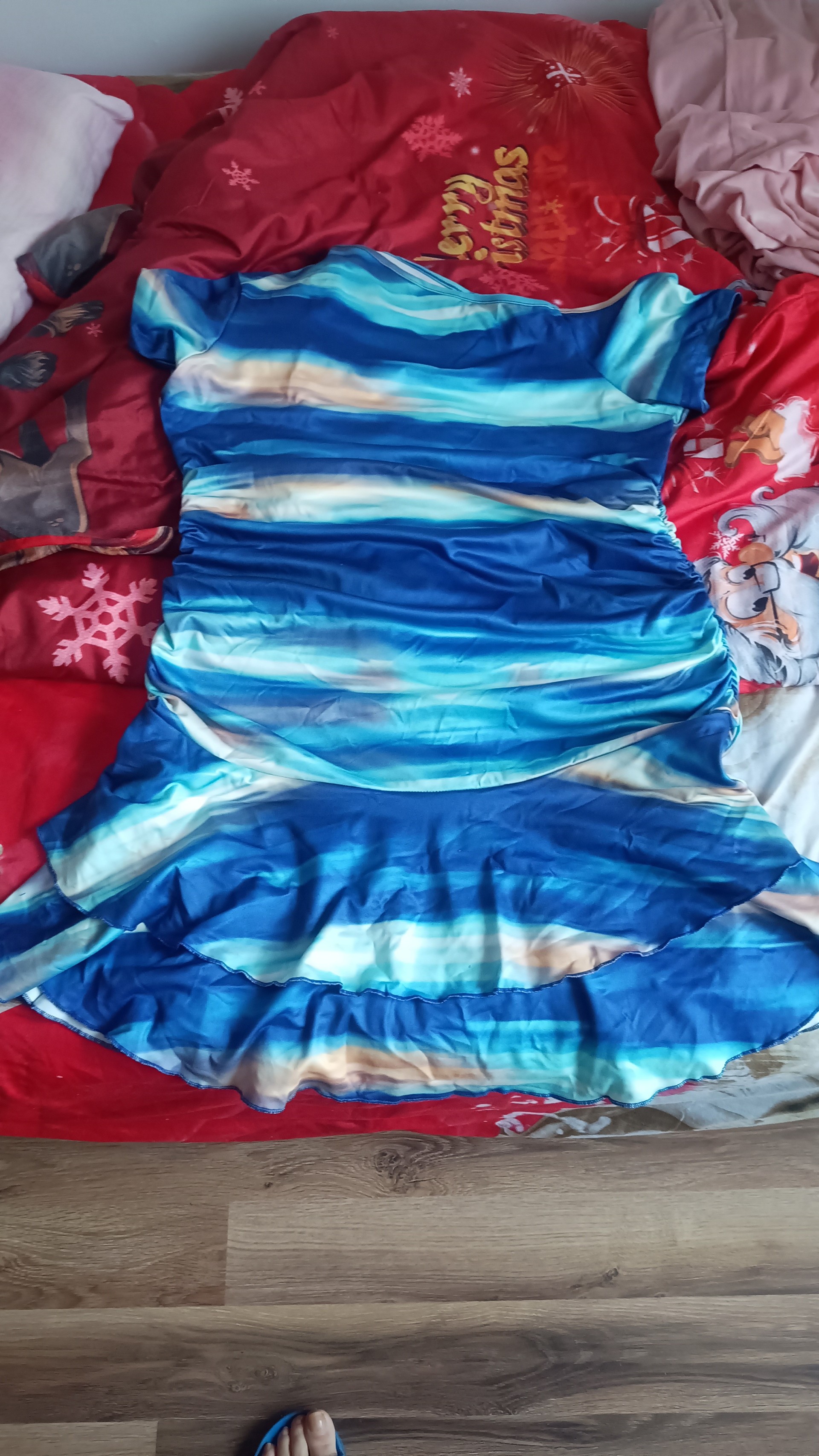 Sprzedam nową sukienkę elastyczna marszczona po bokach rozm XL rękawek krótko jedna część opada.