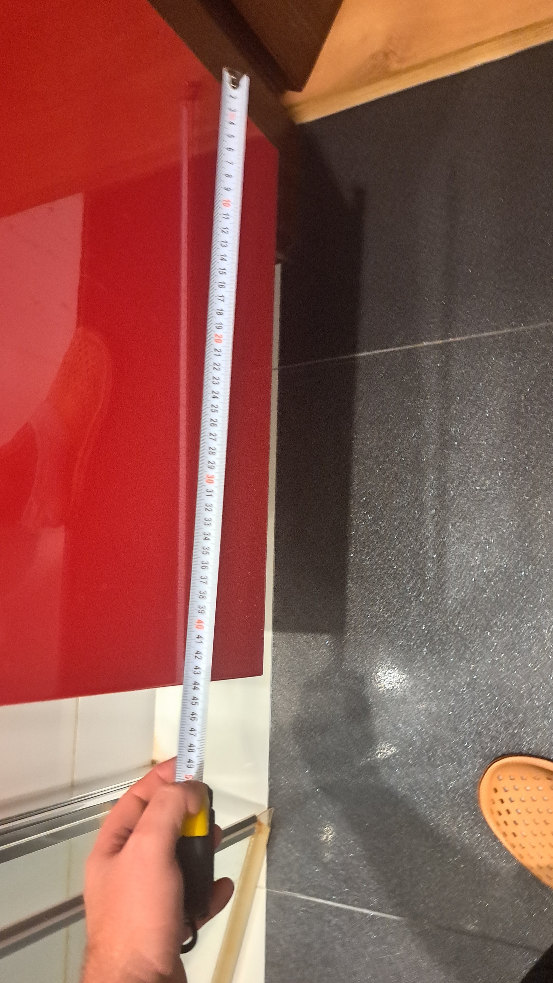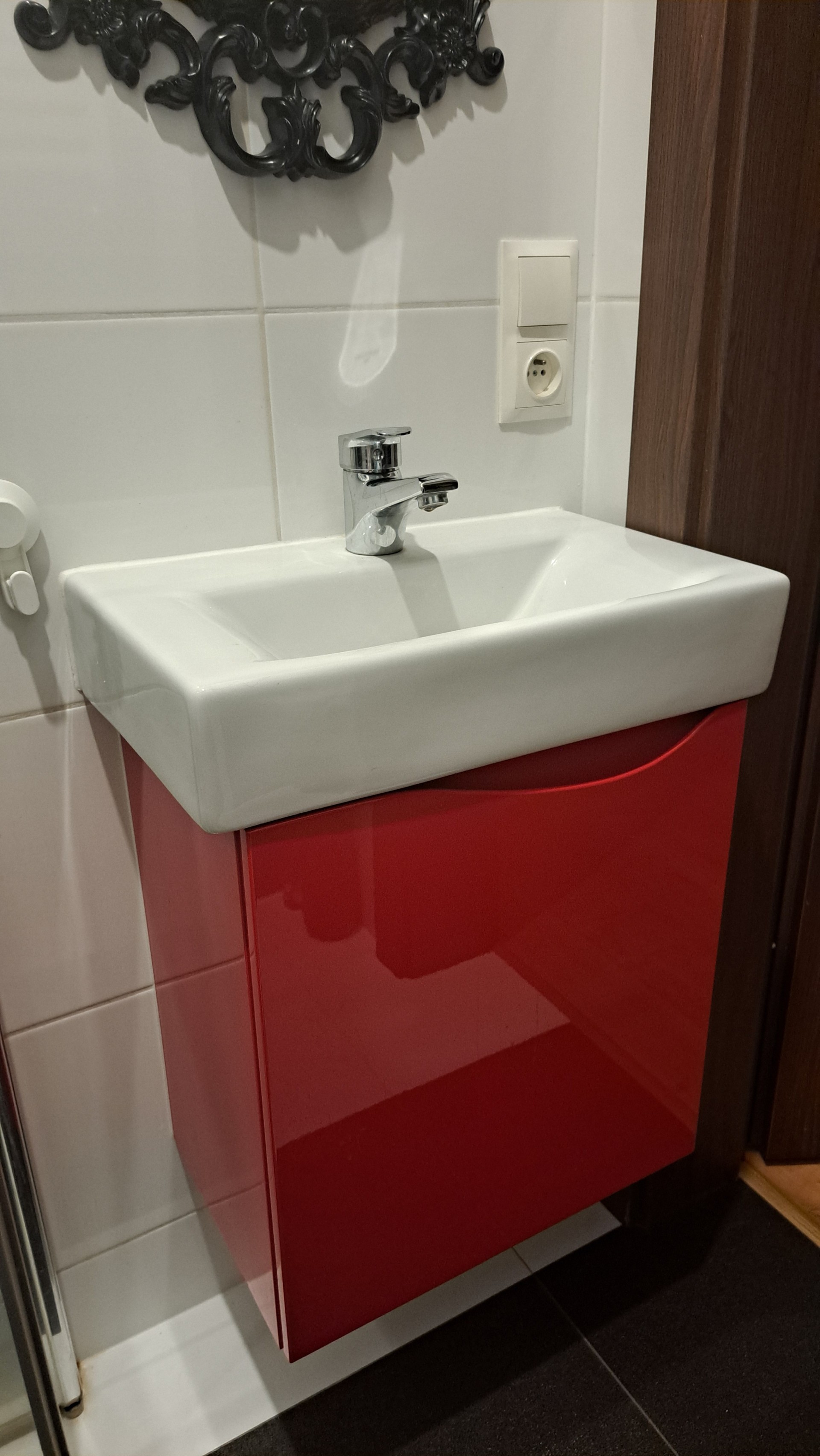Czerwona szafka łazienkowa z umywalką i kranem